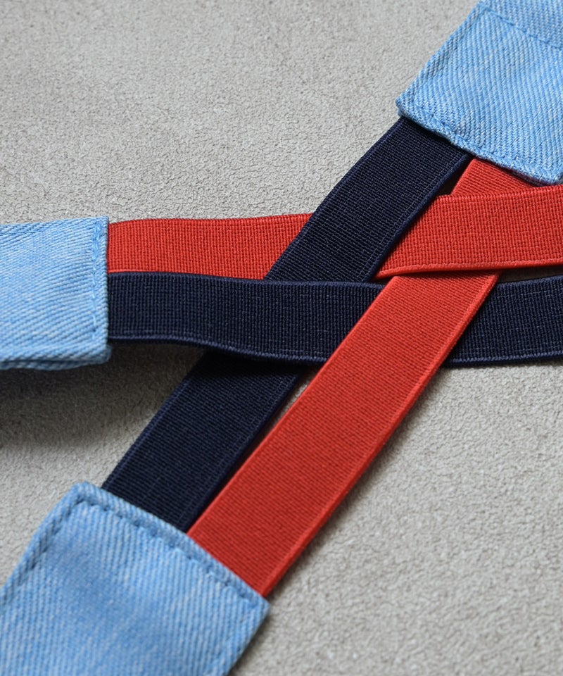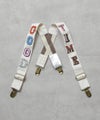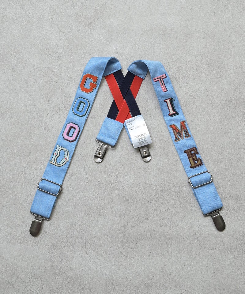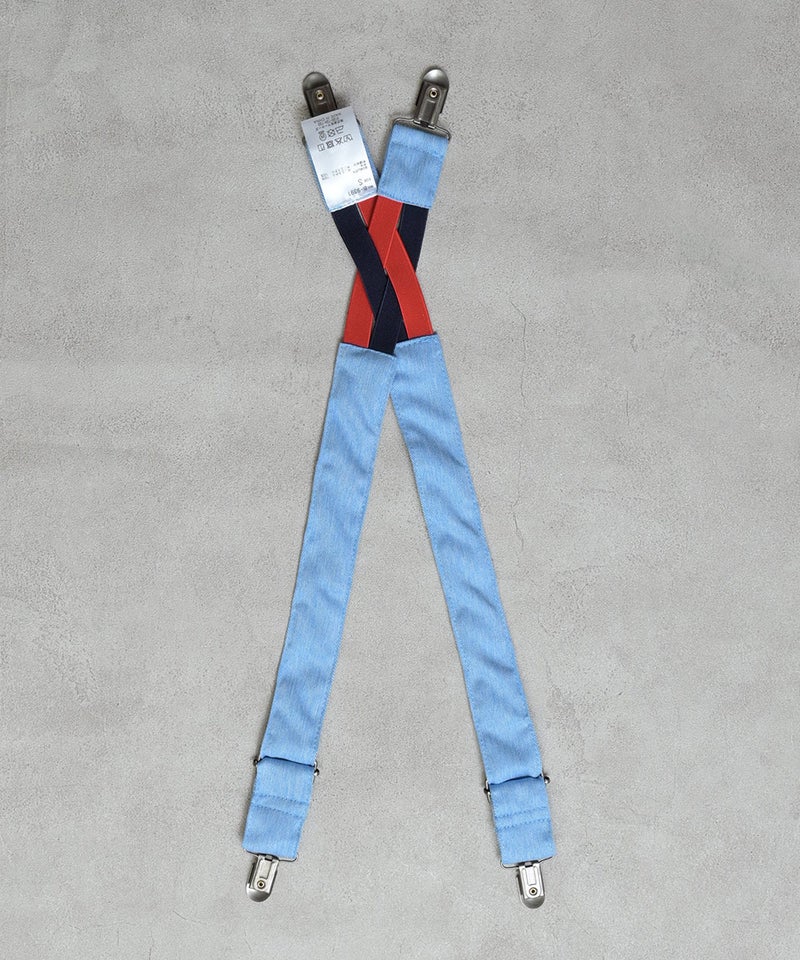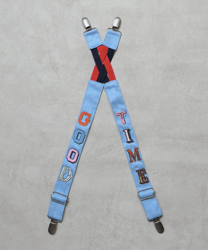 配色ベルトにロゴ刺繍をのせた、存在感たっぷりのサスペンダーです。