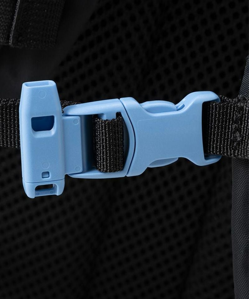 肩にフィットするショルダーハーネスには、一定の荷重で自動開放する安全性を考慮したホイッスル付きチェストバックルを採用しています。