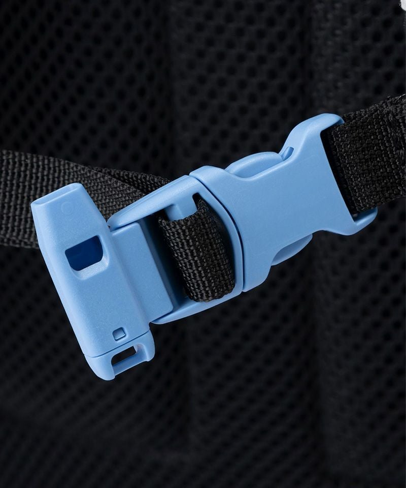 肩にフィットするショルダーハーネスには、一定の荷重で自動開放する安全性を考慮したホイッスル付きチェストバックルを採用しています。