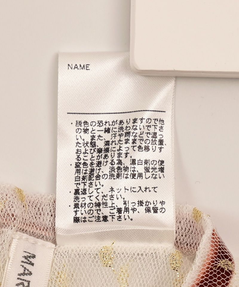 | 素材: | 【チュール(柄)】ナイロン 97% ポリエステル 3% 【チュール(無地)】ナイロン 100% 【リボン部分】ナイロン 100% |