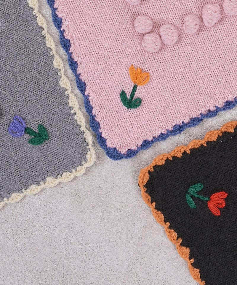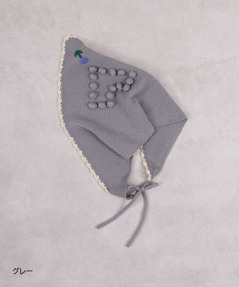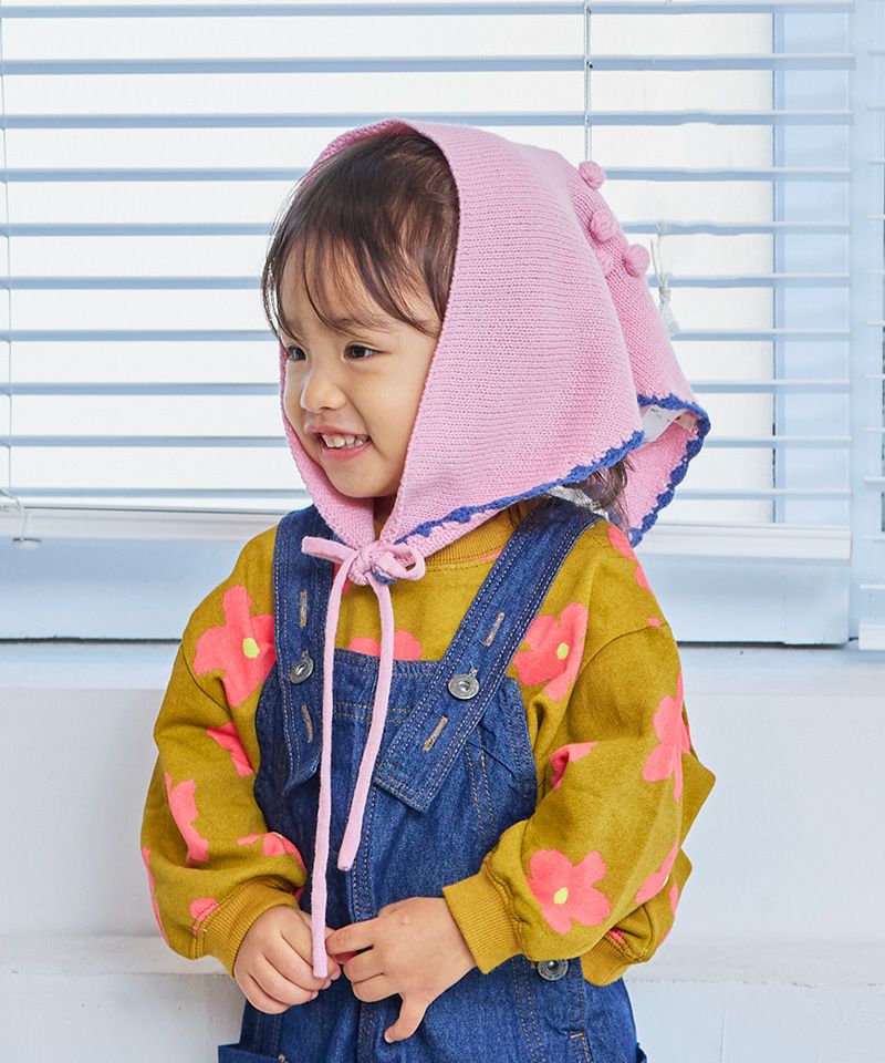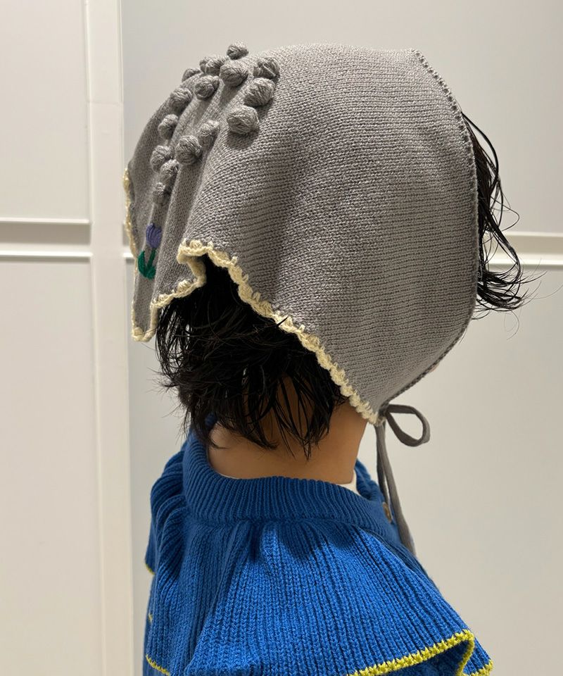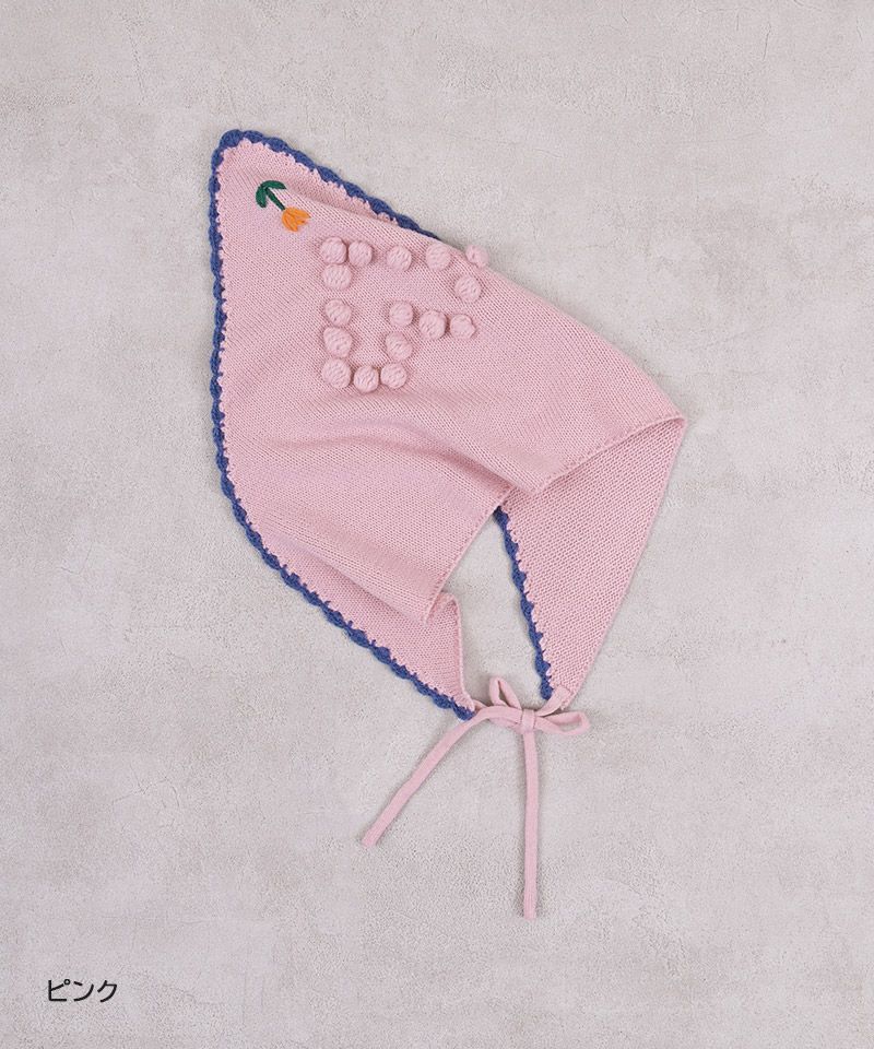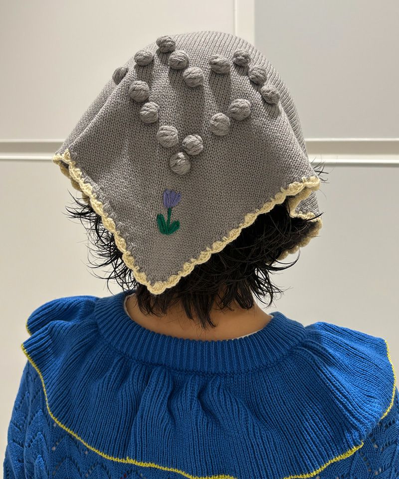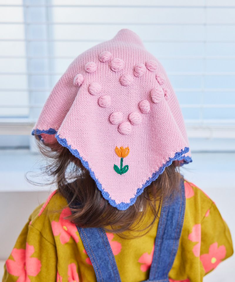 スカラップ編みと、後ろに並んだポンポンの花柄モチーフがさりげない可愛さを添えてくれるポイントです。