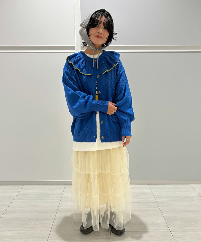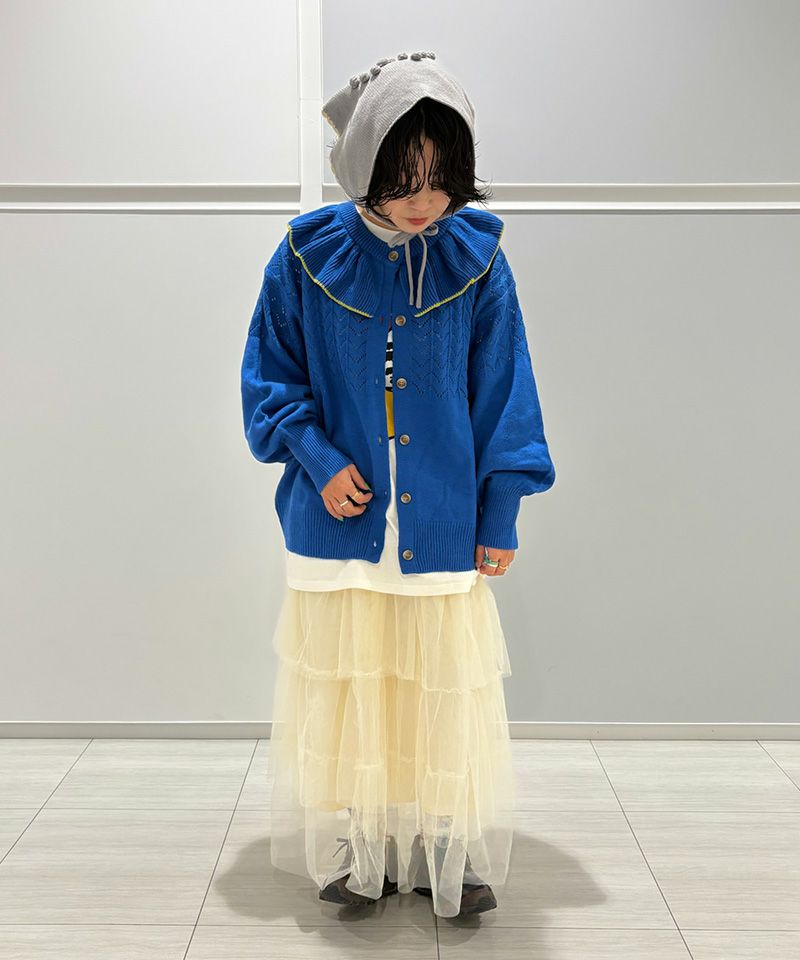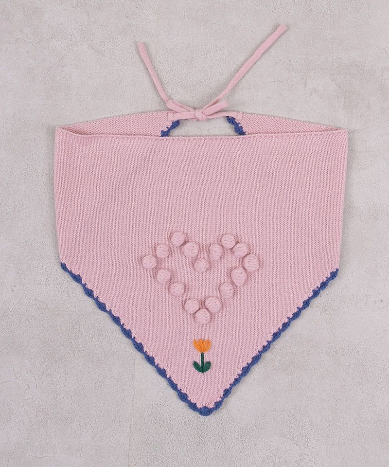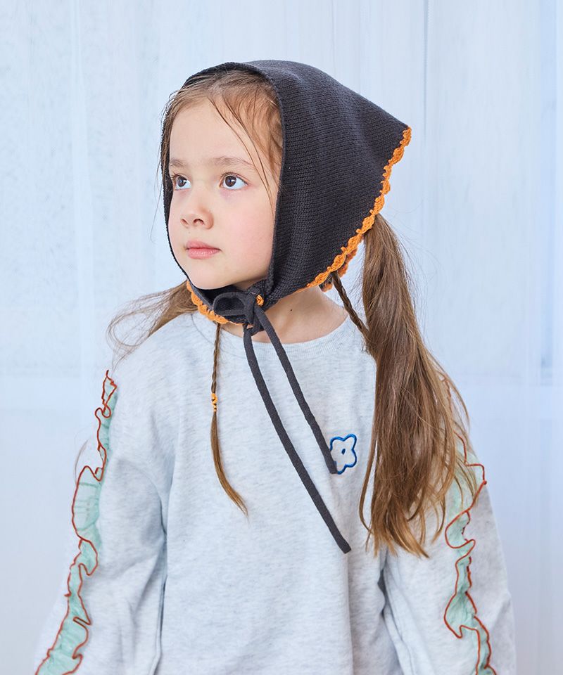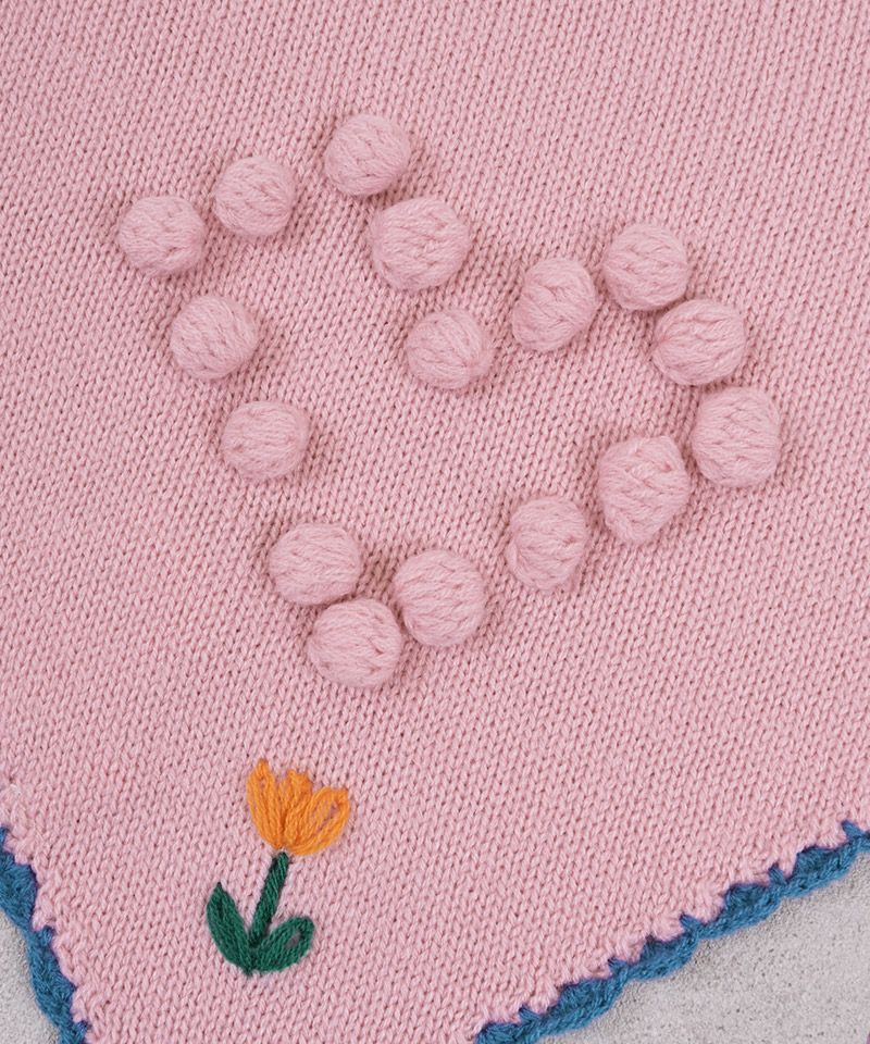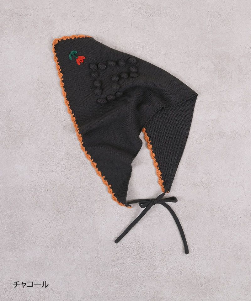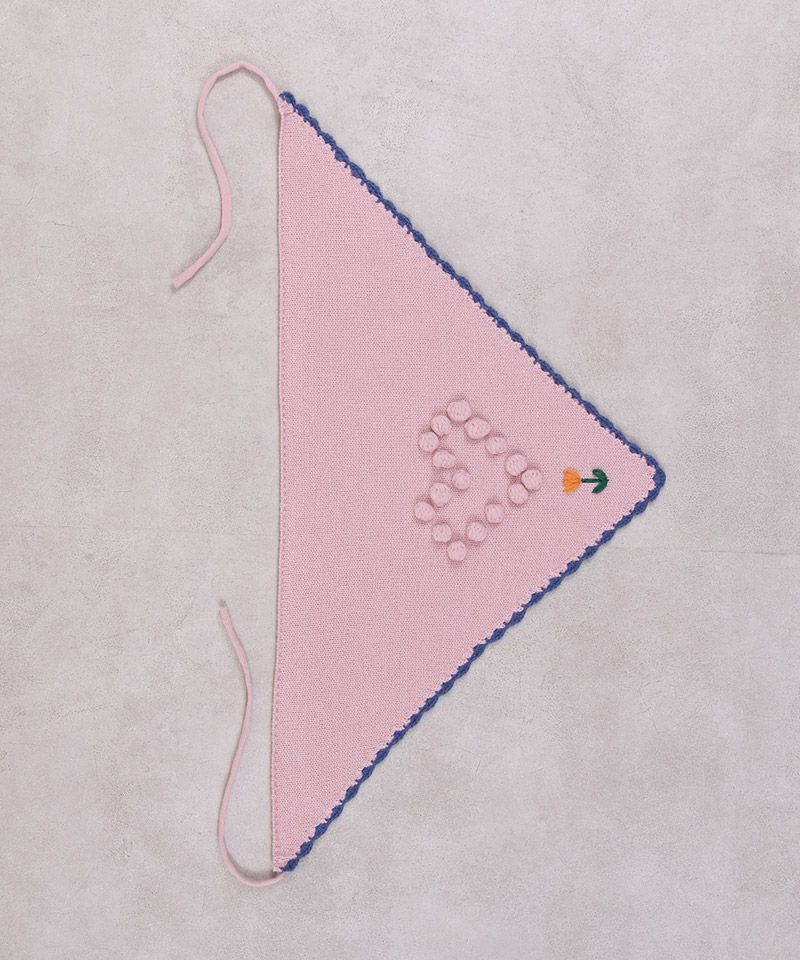 スカラップ編みと、後ろに並んだポンポンの花柄モチーフがさりげない可愛さを添えてくれるポイントです。