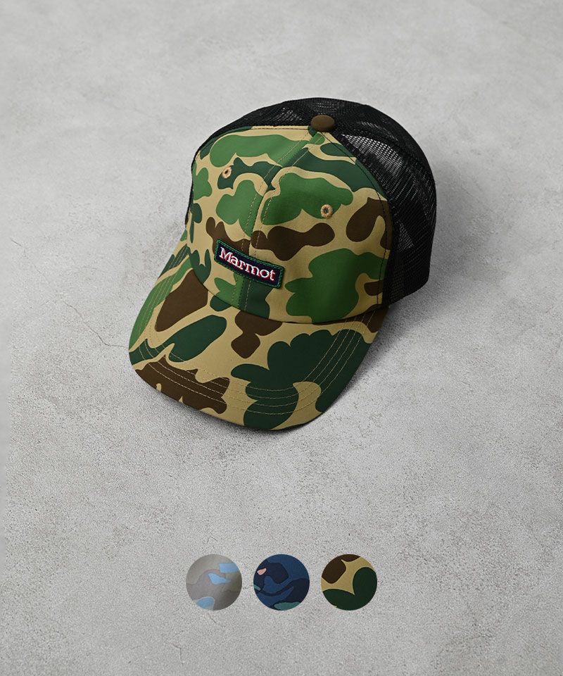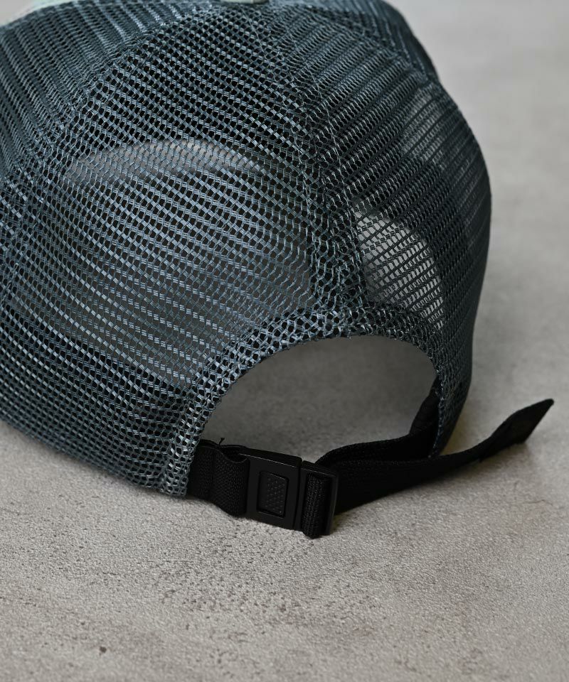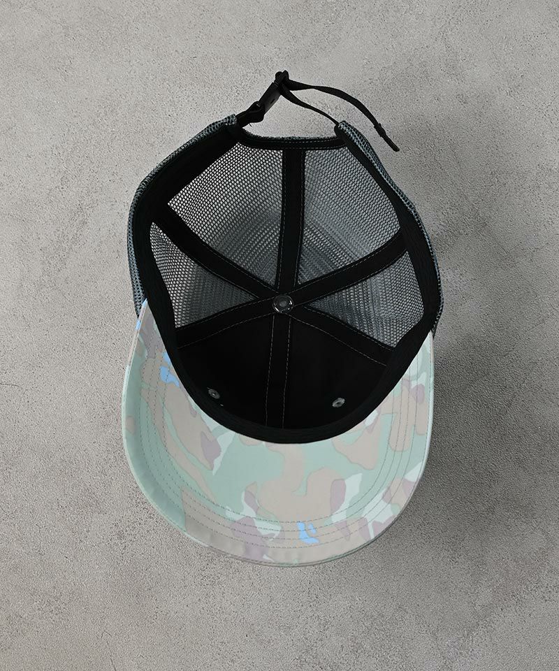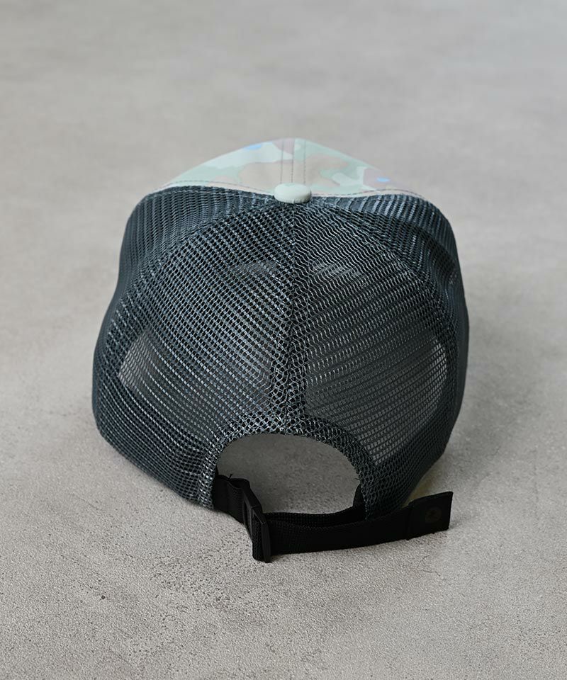 ラウンドしたつば部分と迷彩柄が特徴的なメッシュキャップ。