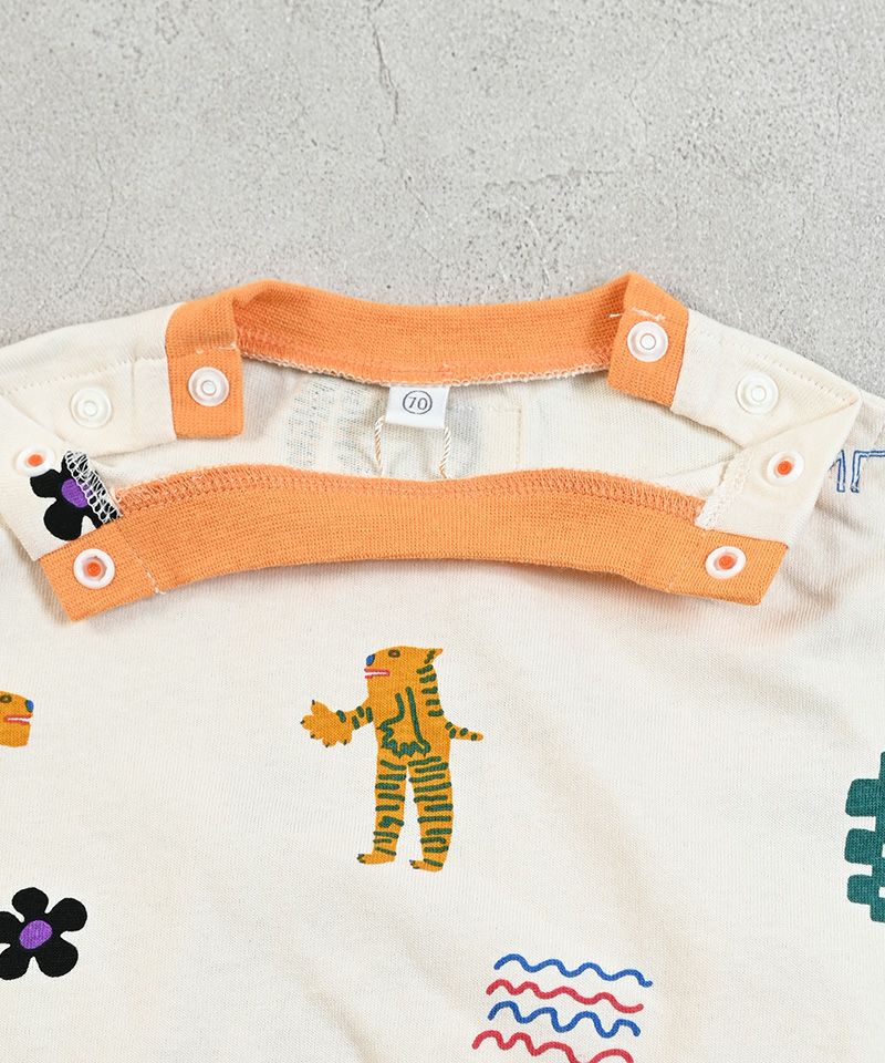 カラフルで遊び心のある総柄が全体にプリントされたロンパース。