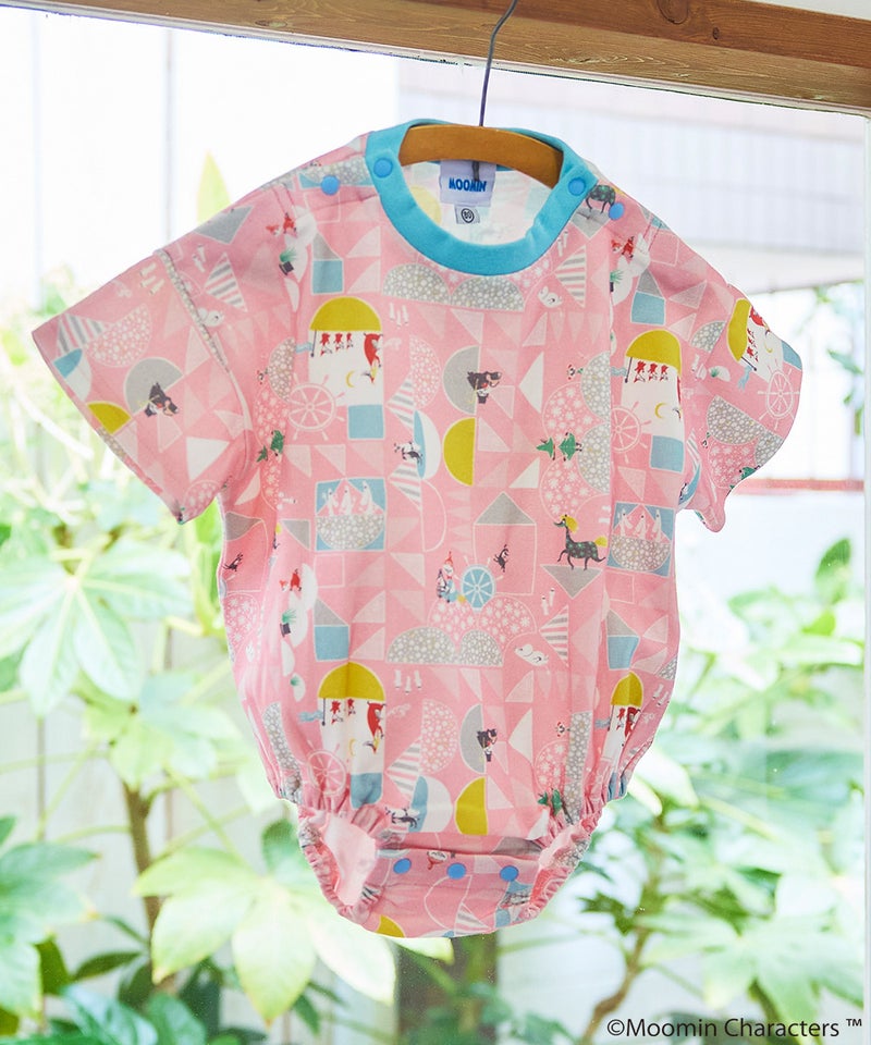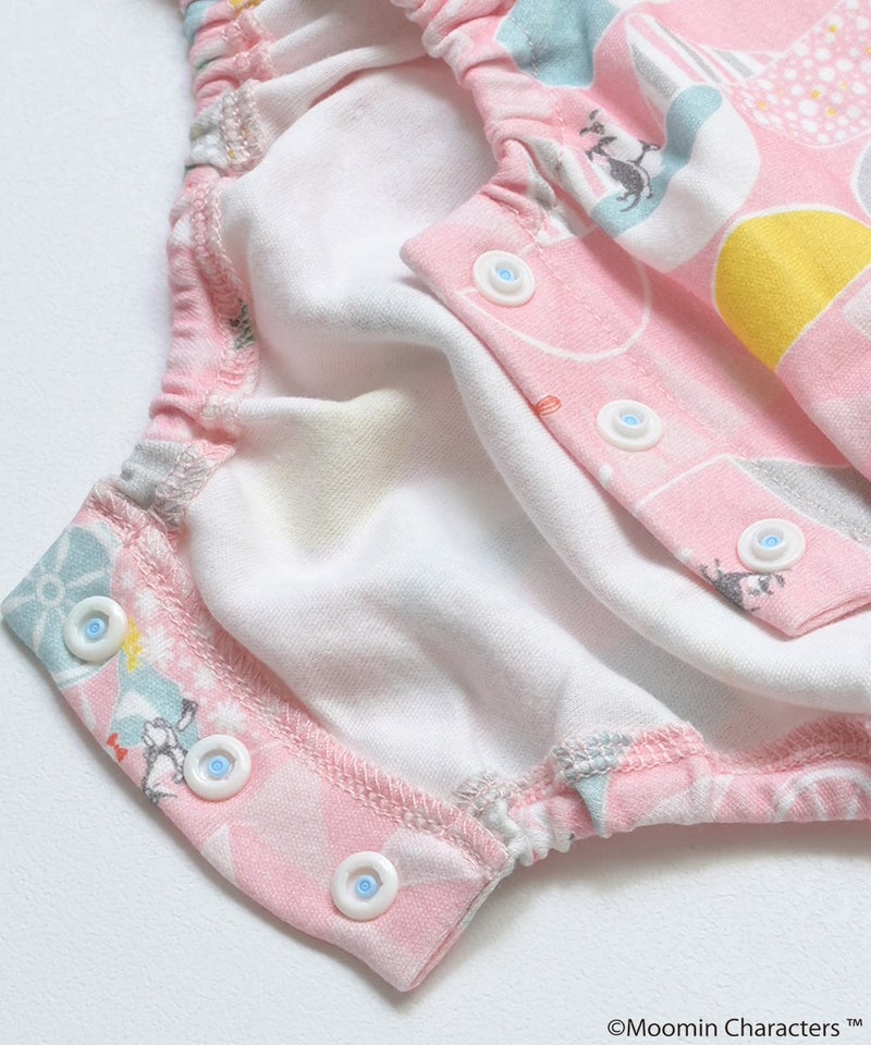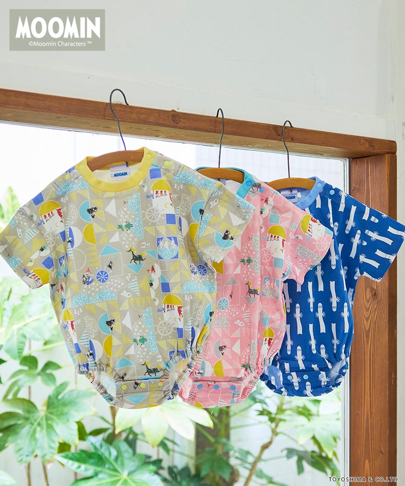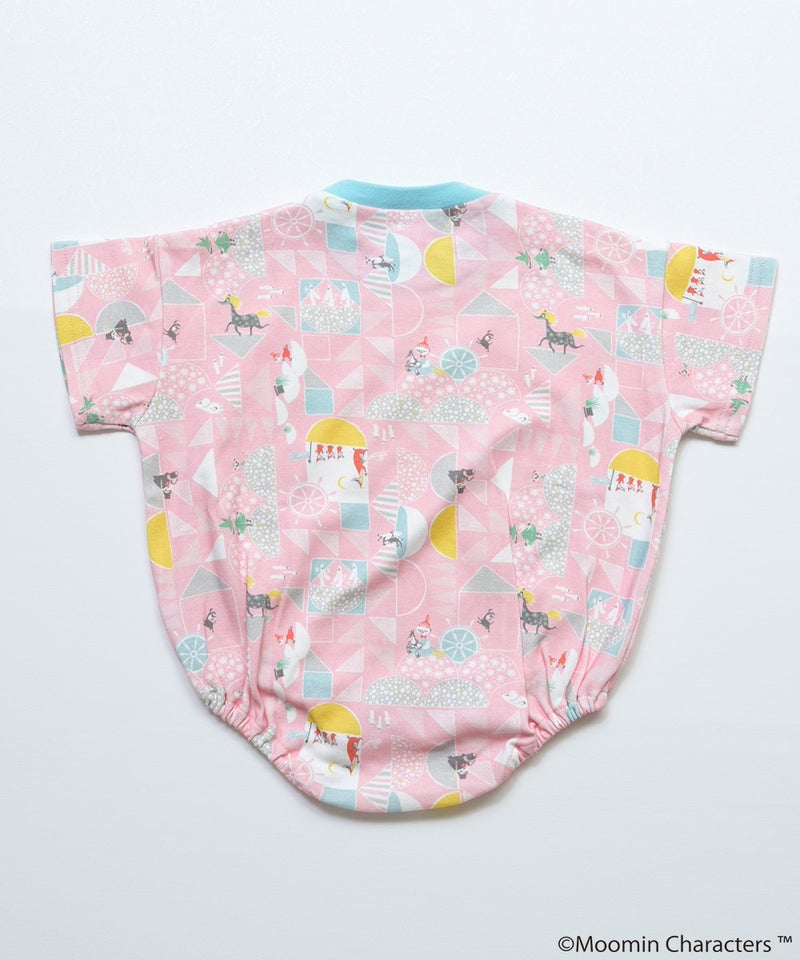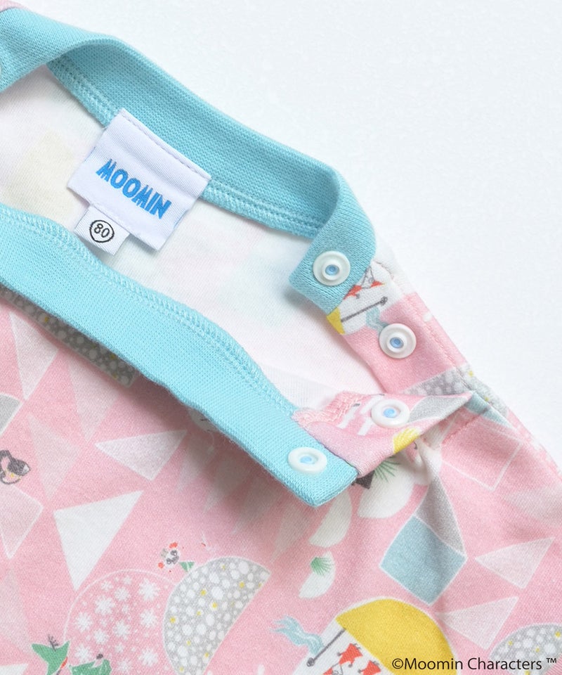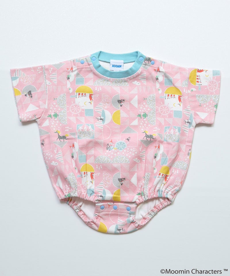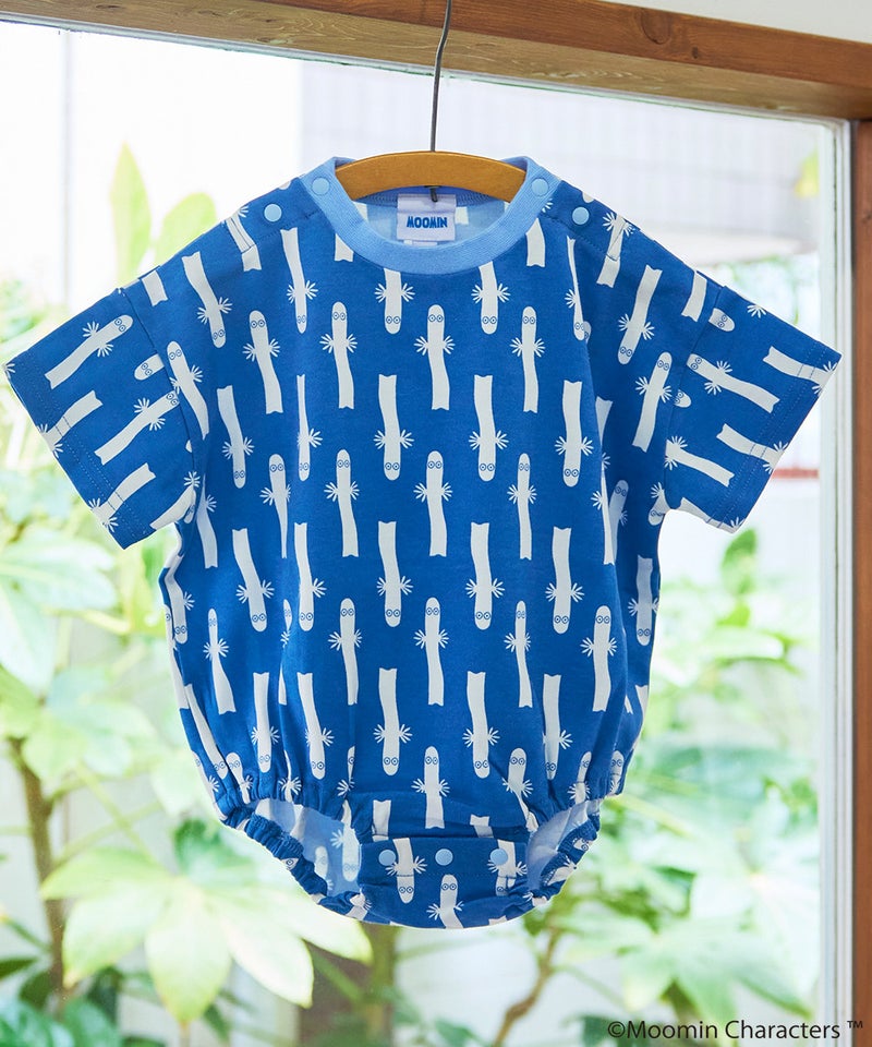 ムーミン谷の仲間たちやモチーフをちりばめた総柄デザインがかわいいロンパース。