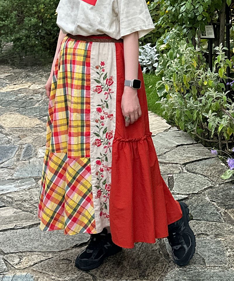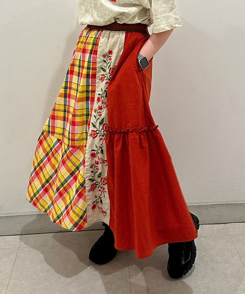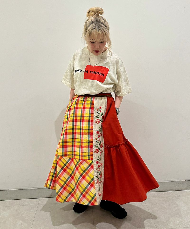 左右で異なる素材とフレアな分量感で、どこから見ても1枚で様になる存在感のあるデザインで、シンプルなTシャツコーデでも手抜きに見えないオシャレ度アップスカートです。
