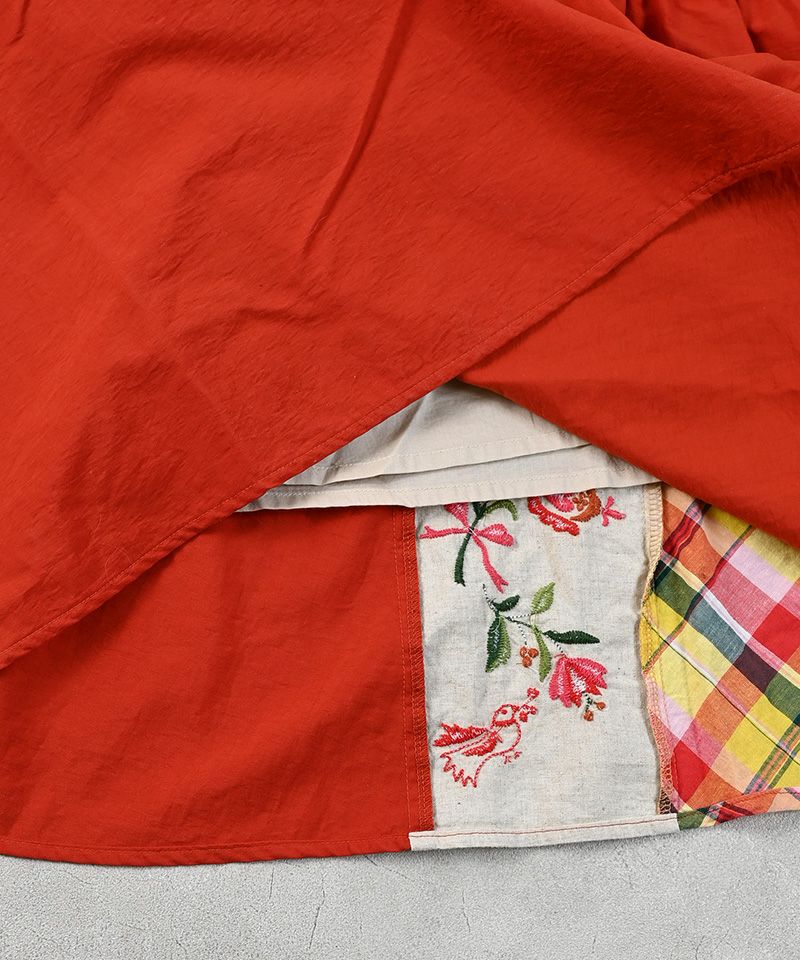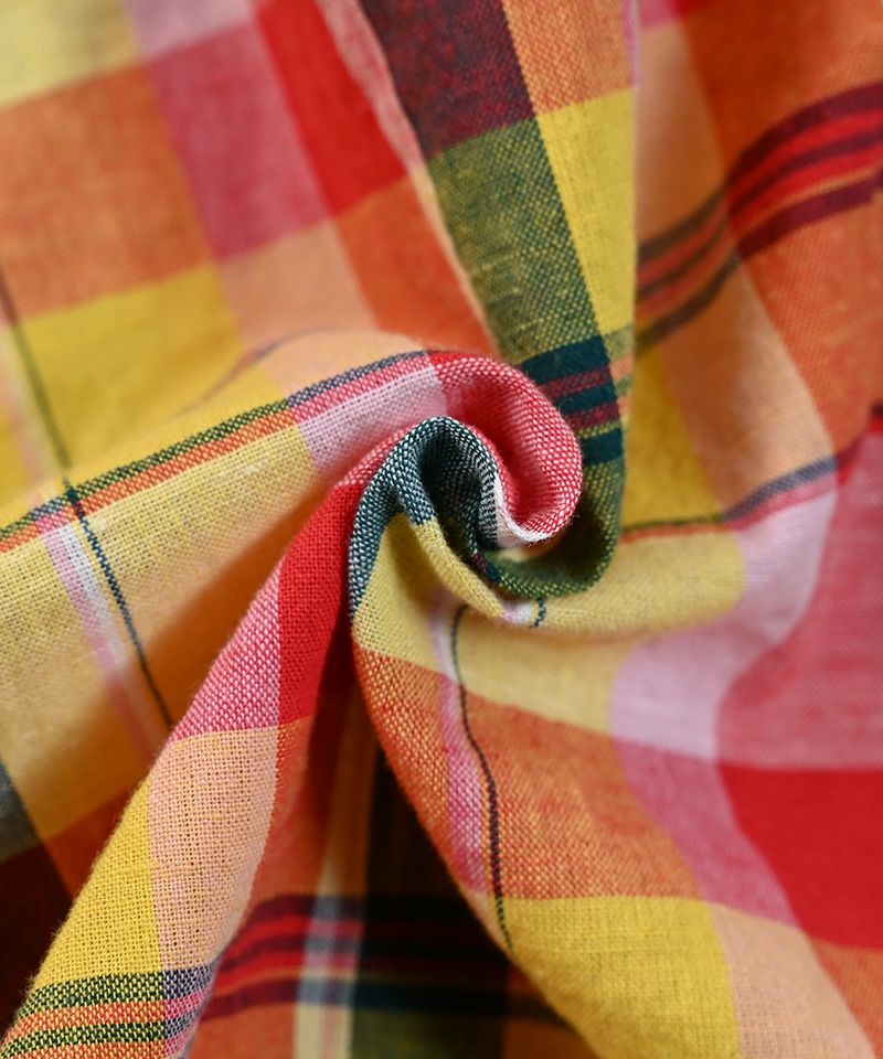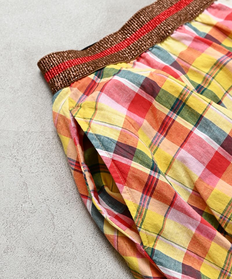 ナチュラルなしぼ感のある素材に刺繍を施し、プレッピーな夏の定番マドラスチェックで切り替えて夏の日差しに映える鮮やかなカラーリングでプレイフルなムードに仕上げました。