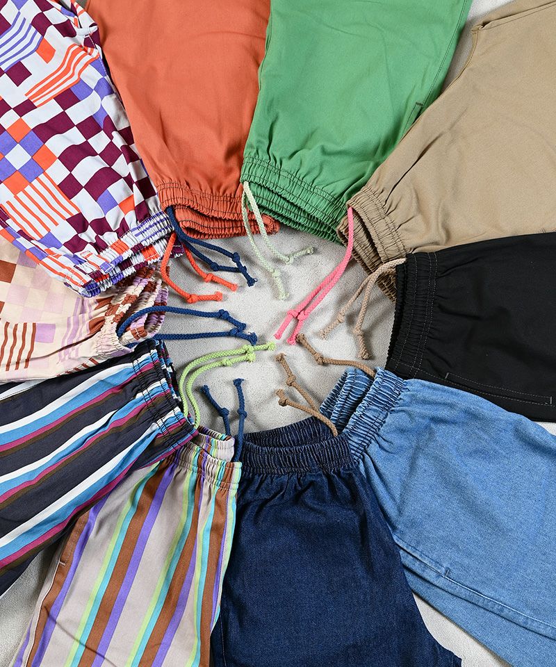 ウエストゴム仕様でサッと着用でき、尚且つずれ落ちないようにコードでキュッと縛ります。