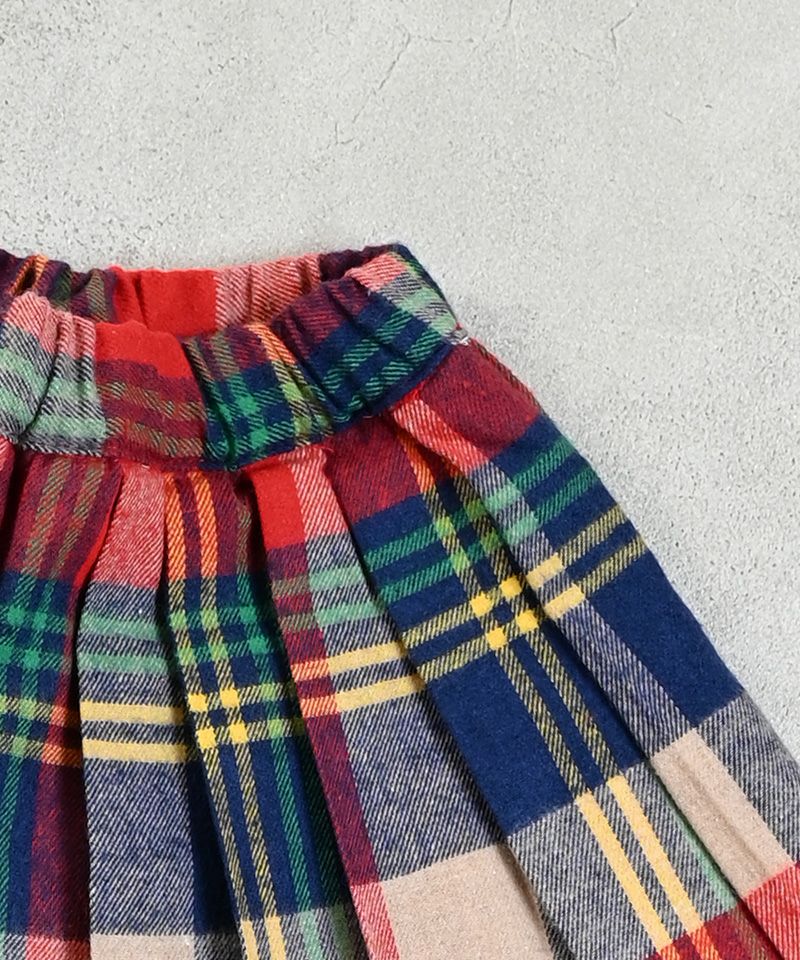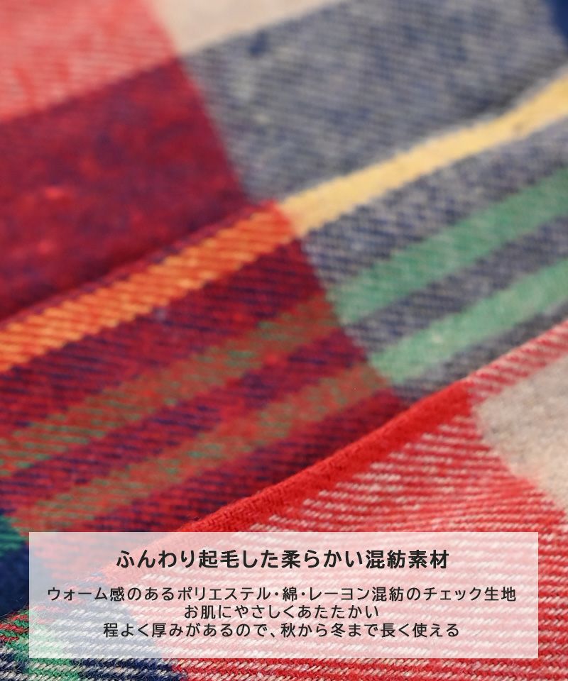 ポリエステル・綿・レーヨン混紡のチェック生地は、やわらかくて肌ざわりが優しい一枚。