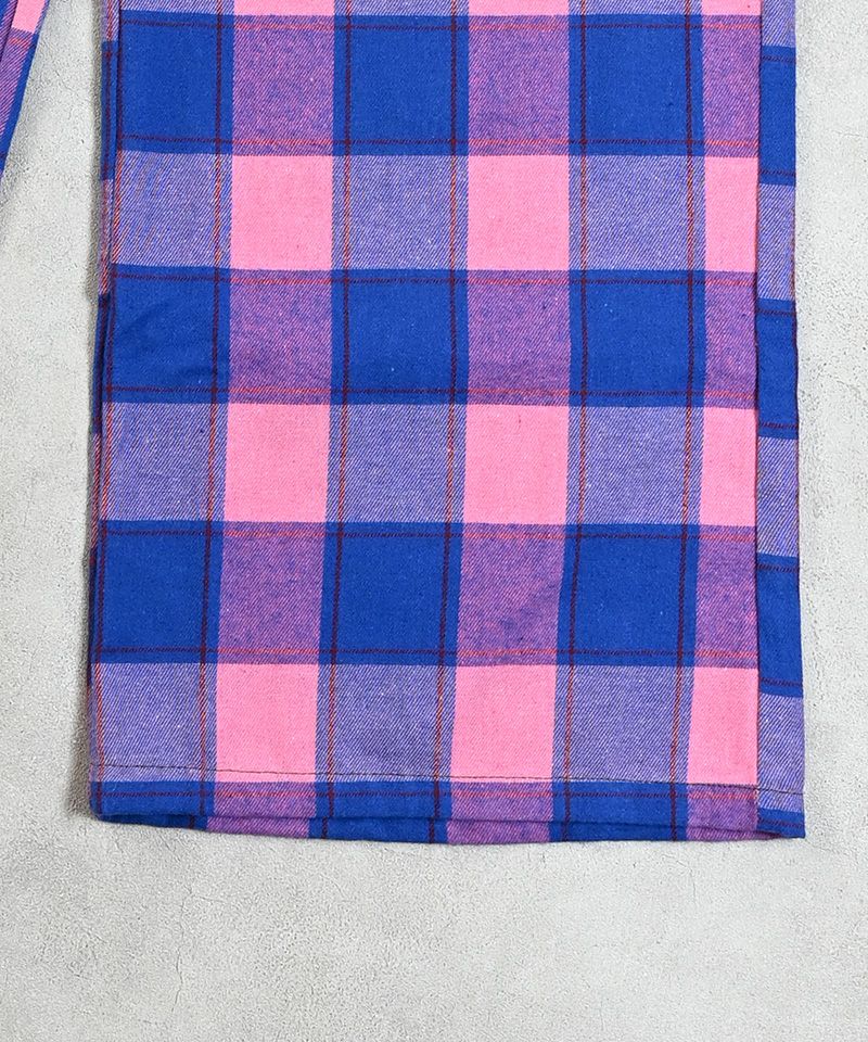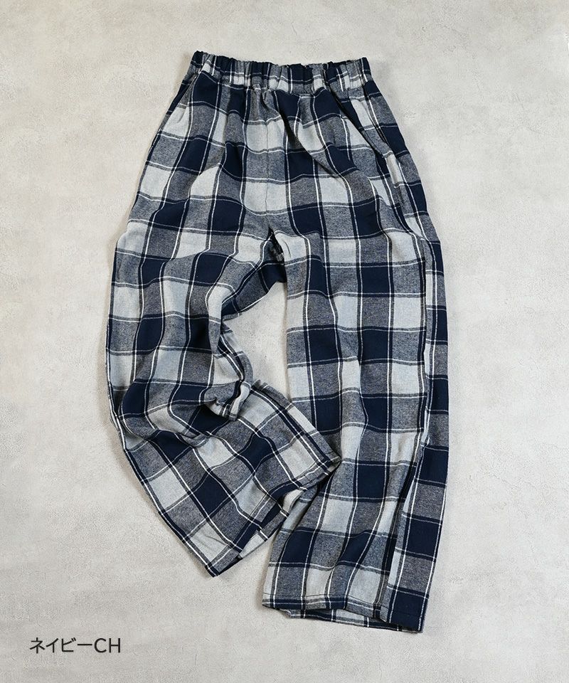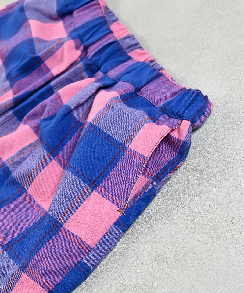 ポリエステル・綿・レーヨン混紡のチェック生地は、やわらかくて肌ざわりが優しい一枚。