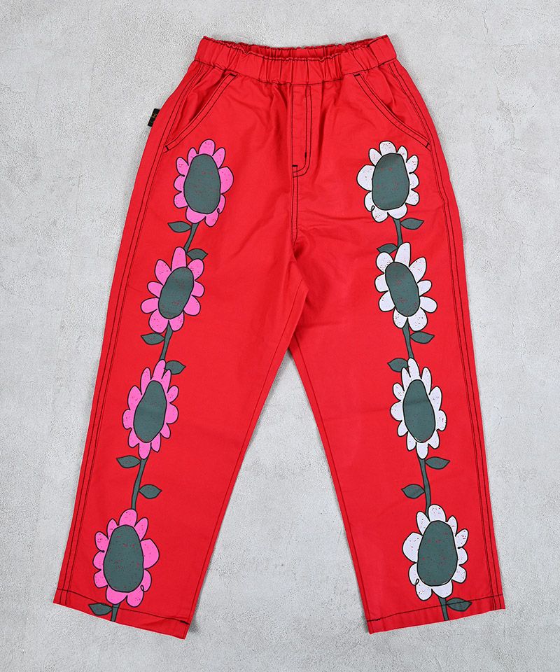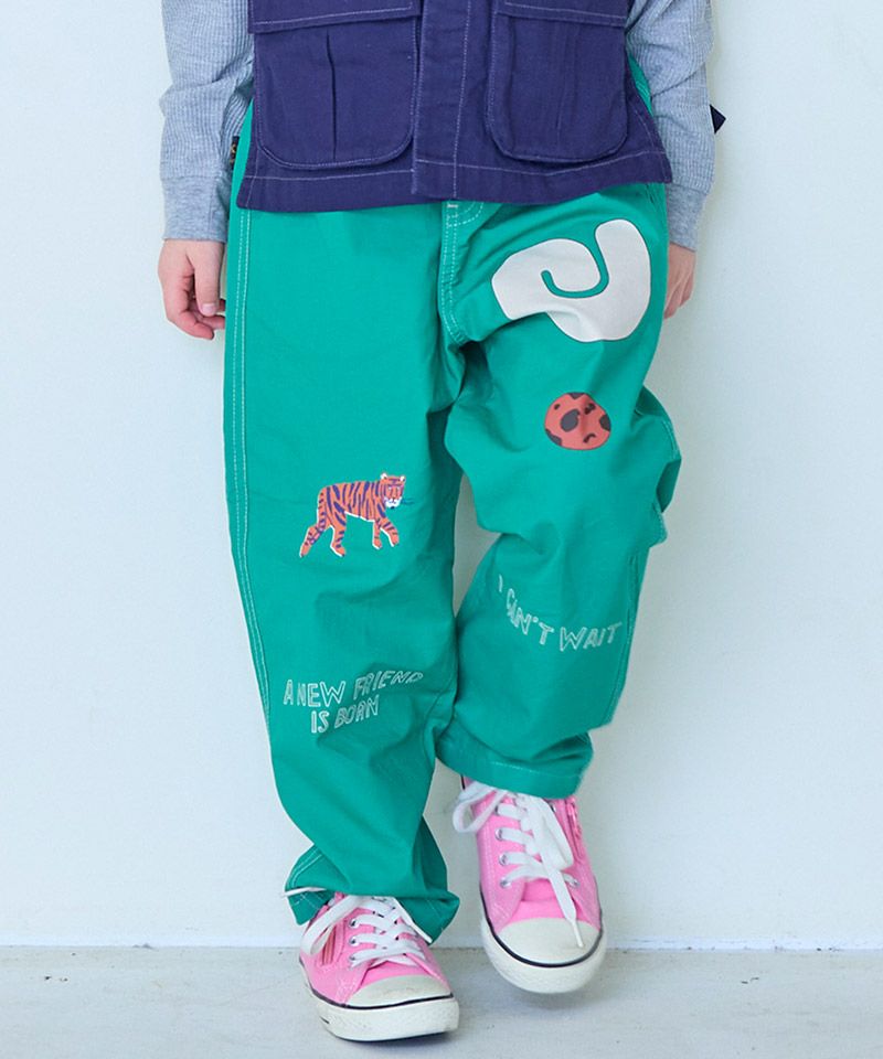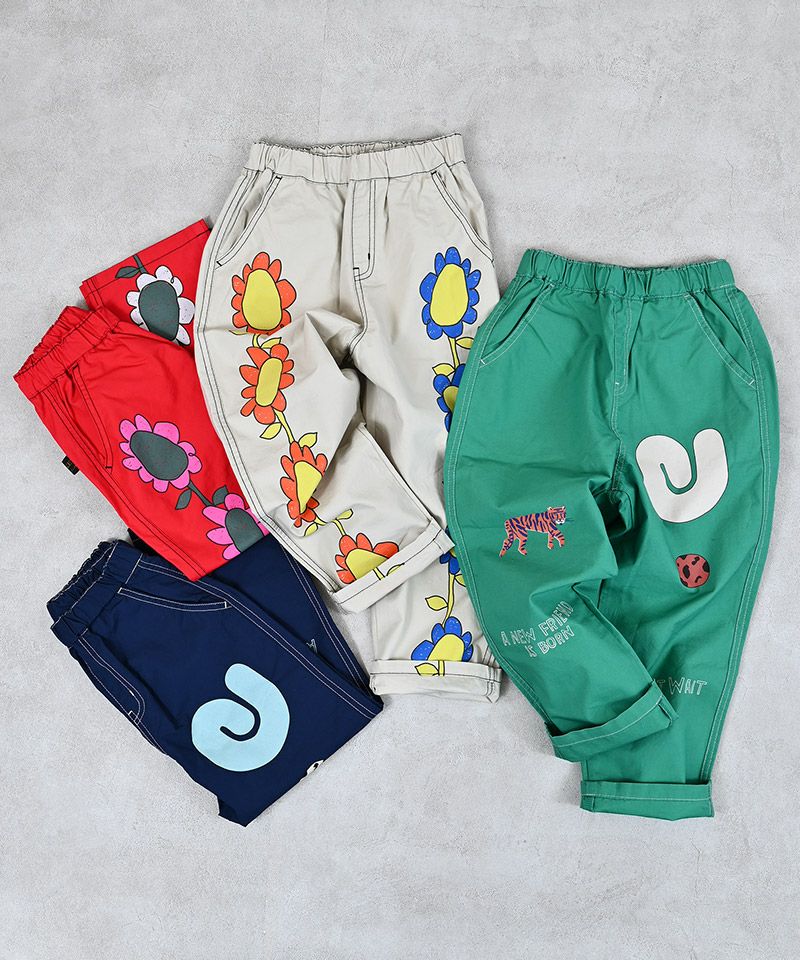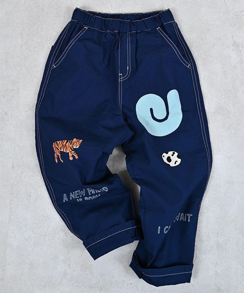 目を引くプリントがポイントのツイルパンツ。
