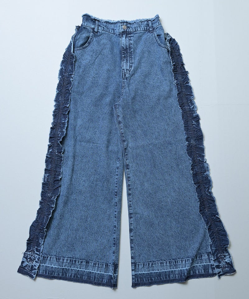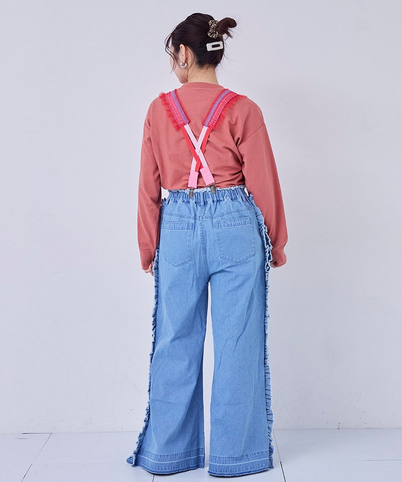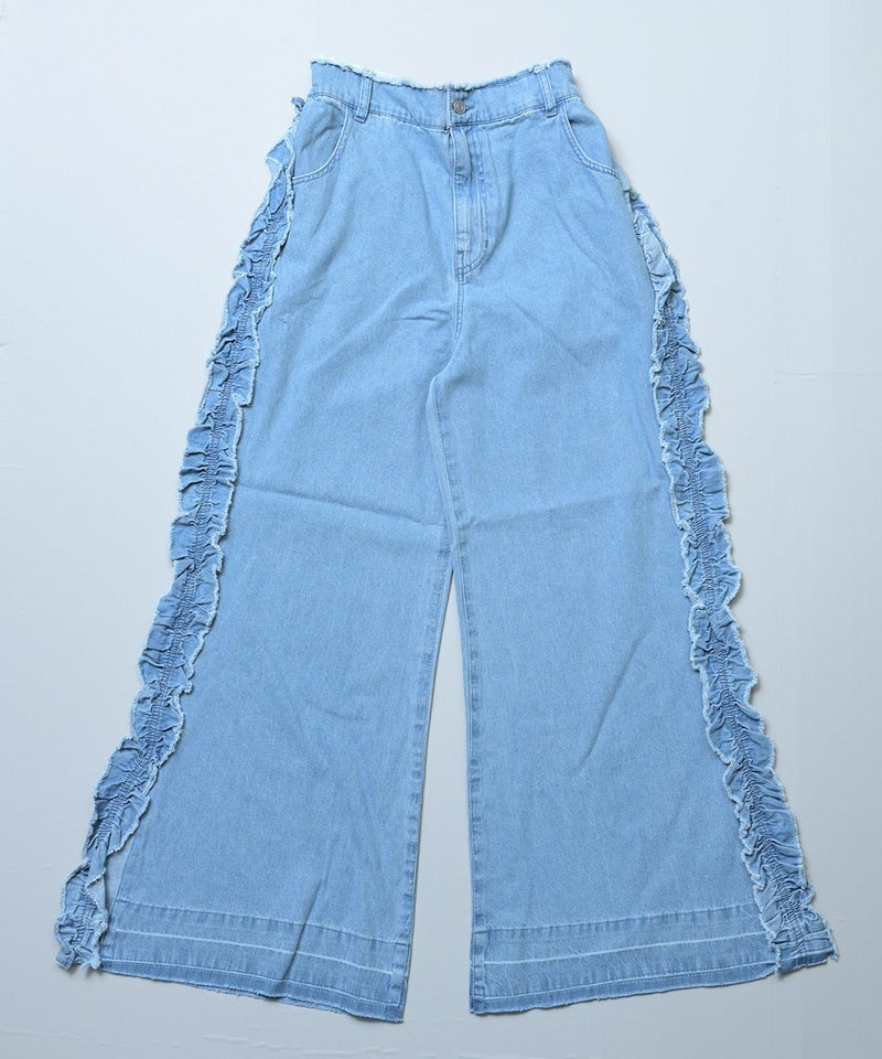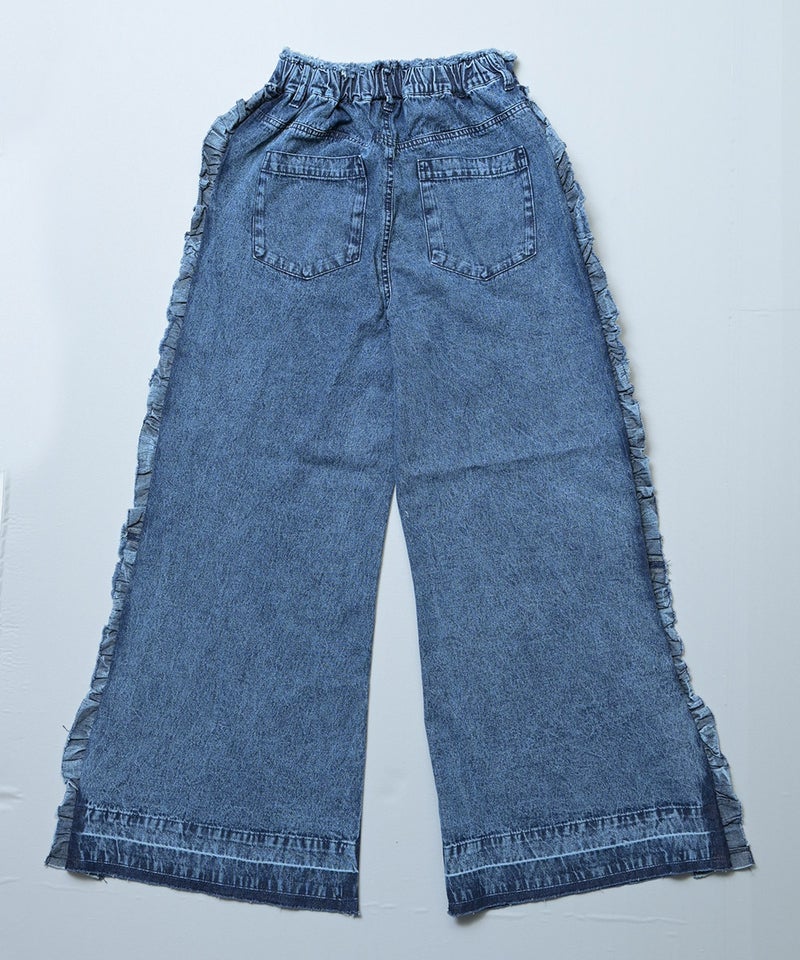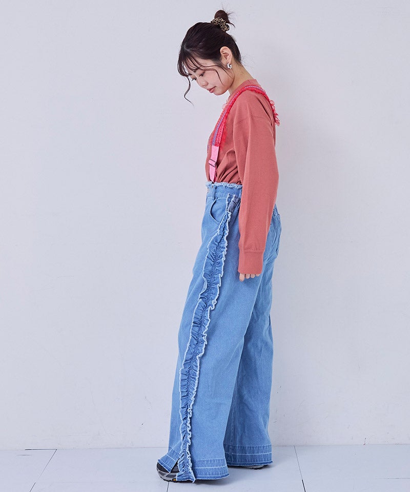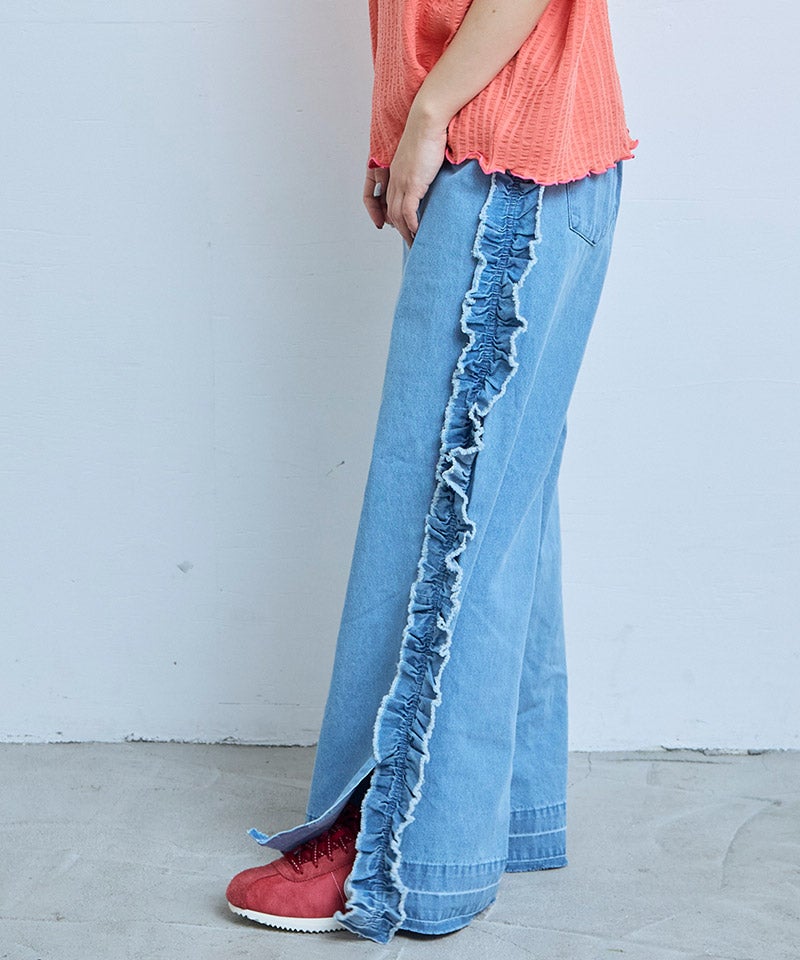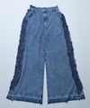 サイドにたっぷりとあしらったフリンジ風フリルが目を惹くバギーパンツ。