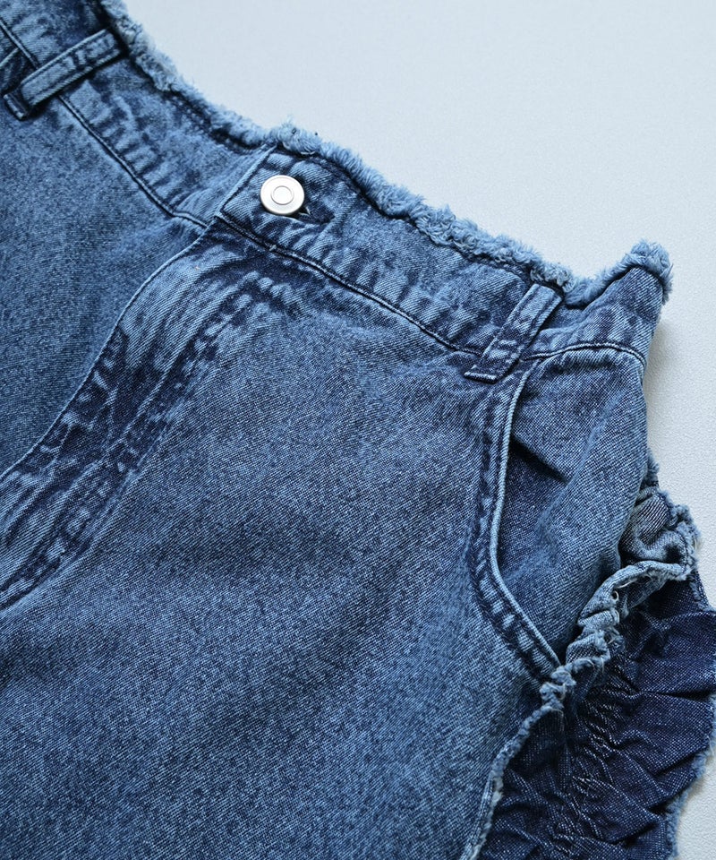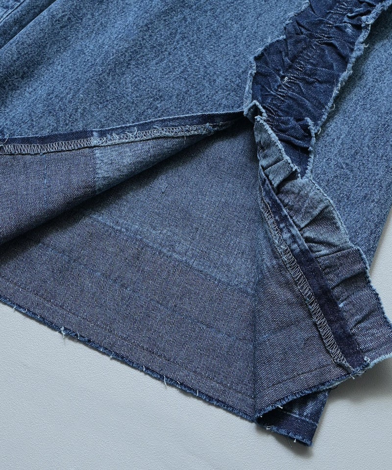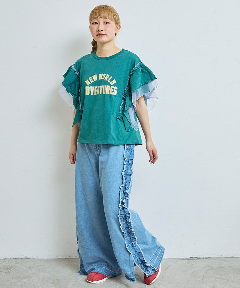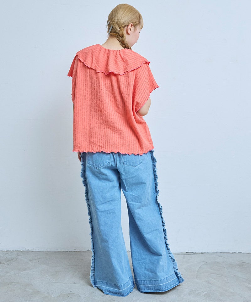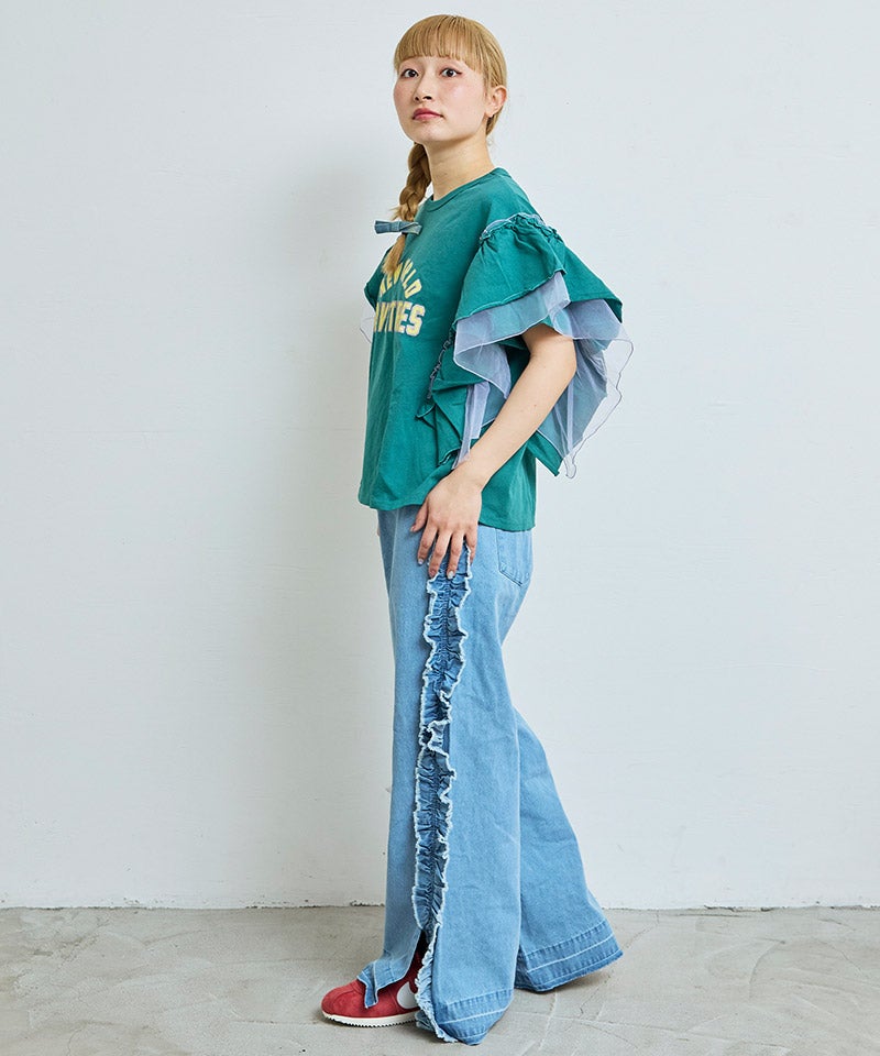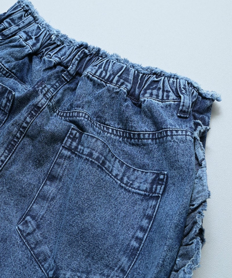 サイドにたっぷりとあしらったフリンジ風フリルが目を惹くバギーパンツ。