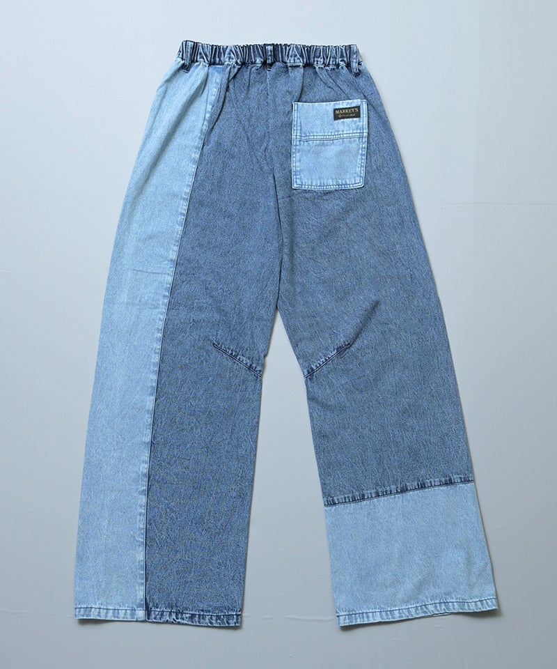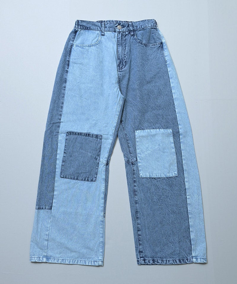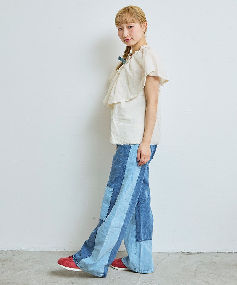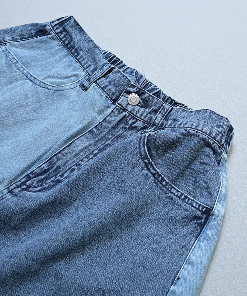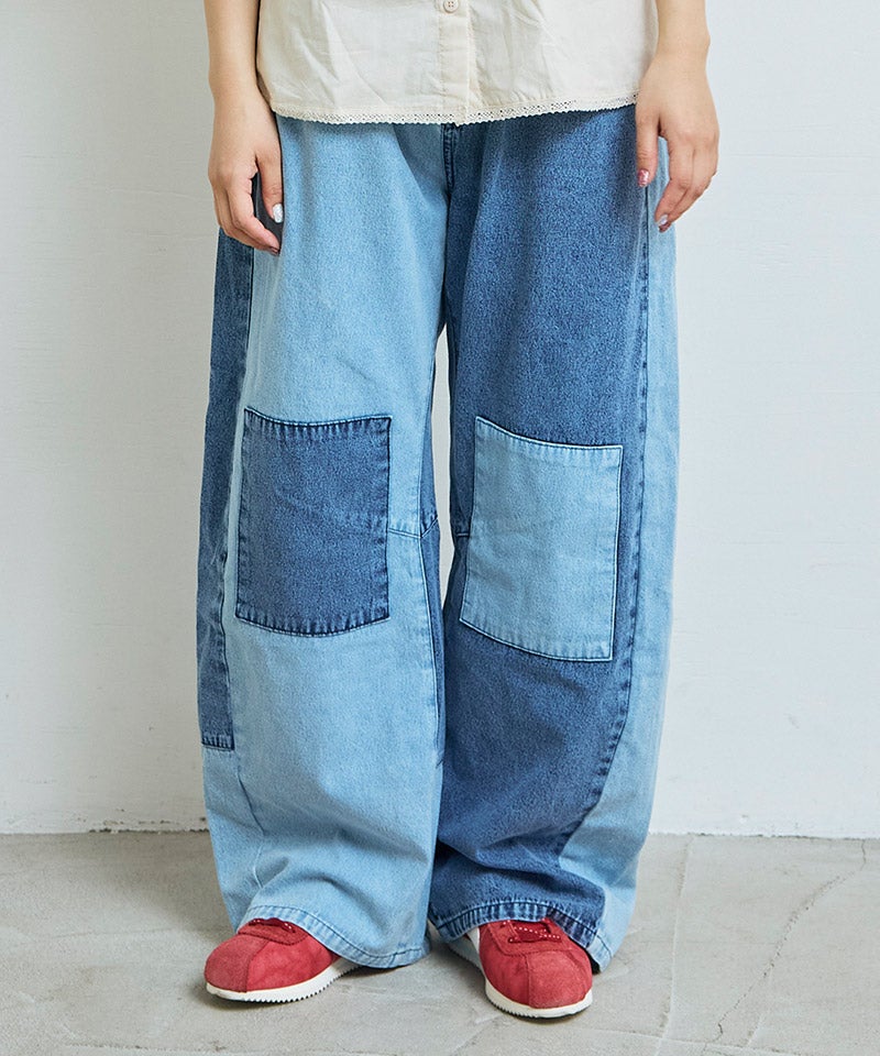 濃淡の違うデニムを切り替えたパッチワークデザイン。