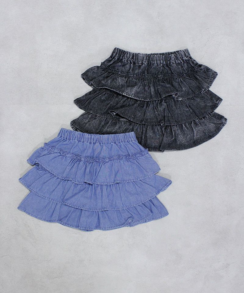 ウエストにあしらったフリルがポイントのデニムキュロットパンツ。