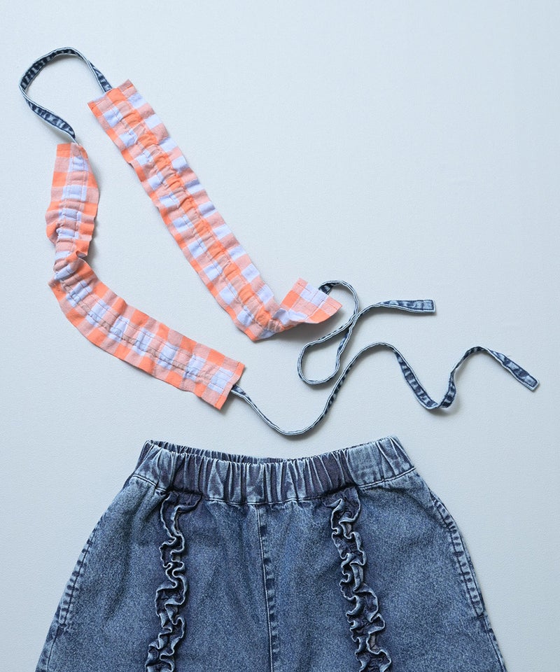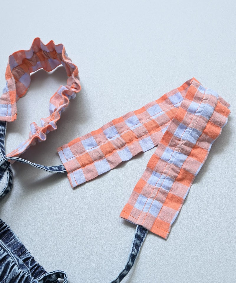 肩ヒモのギンガムフリルは、ギャザーをきゅっと寄せてボリュームを出したり、伸ばしてすっきり見せたりと調整が可能です。