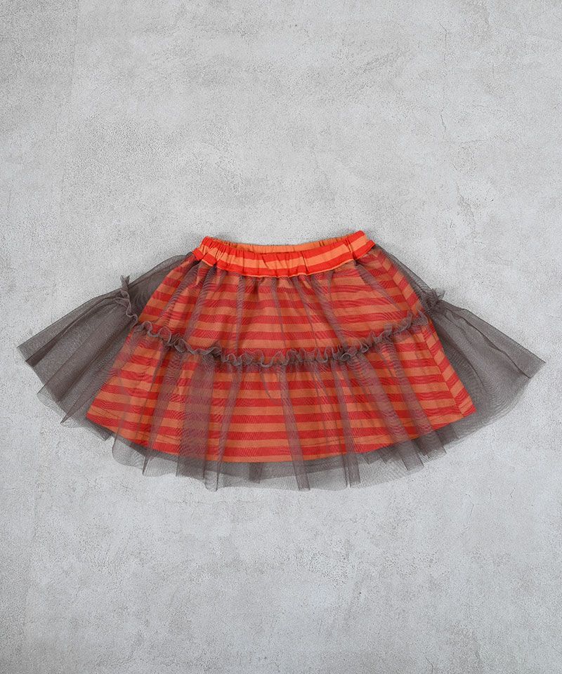 ・ボーダー柄のスカートにチュールを重ねた異素材レイヤードデザイン
