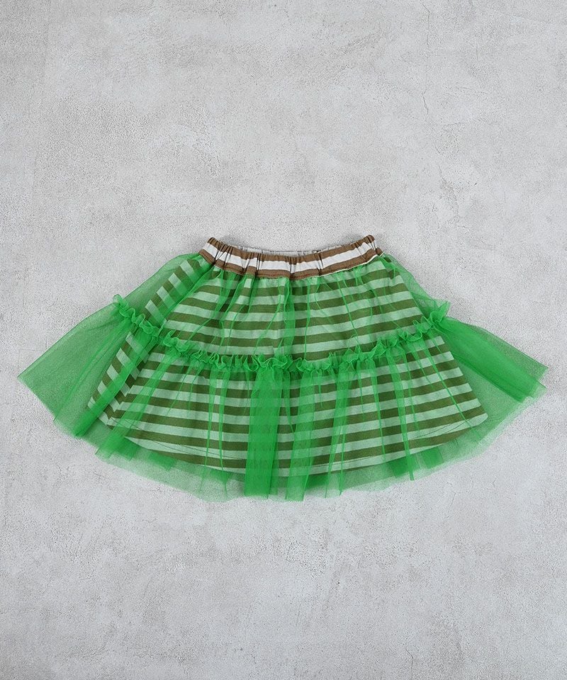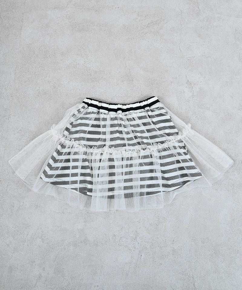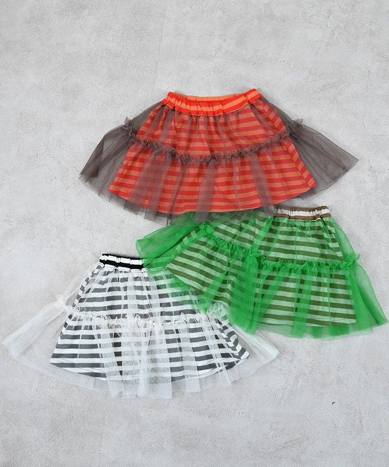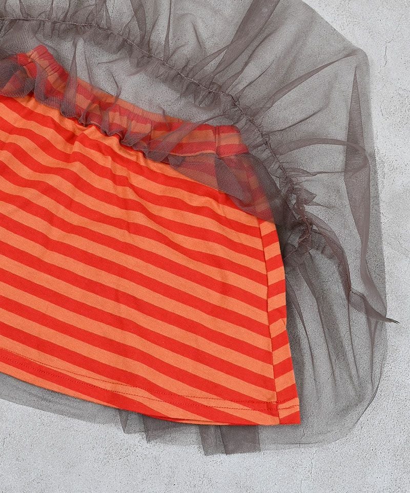 ・ボーダー柄のスカートにチュールを重ねた異素材レイヤードデザイン
