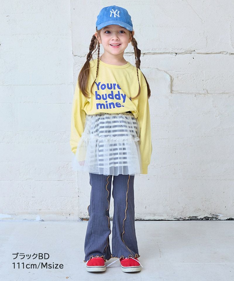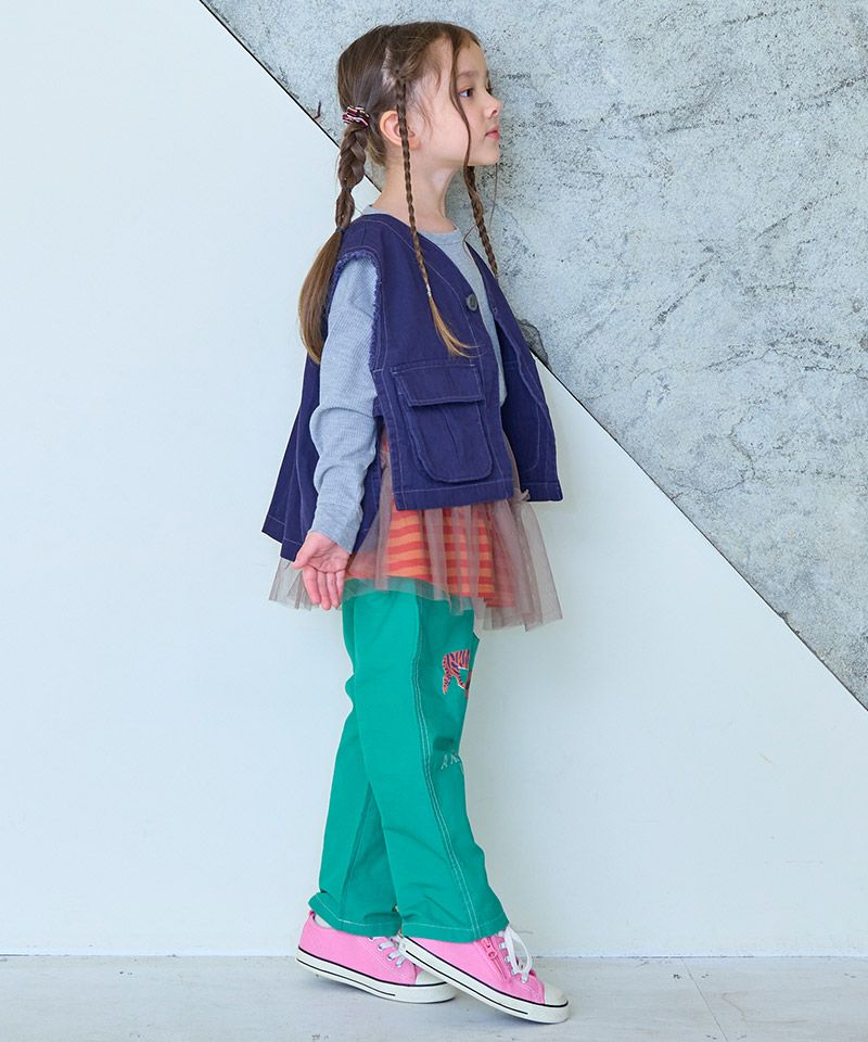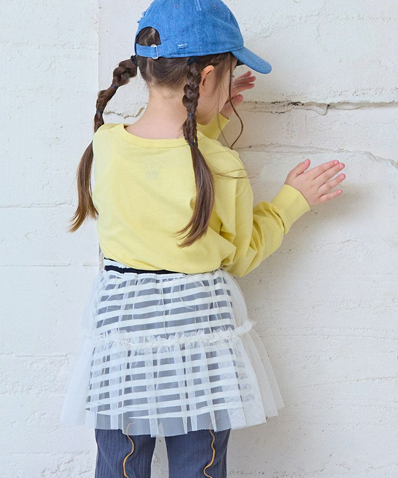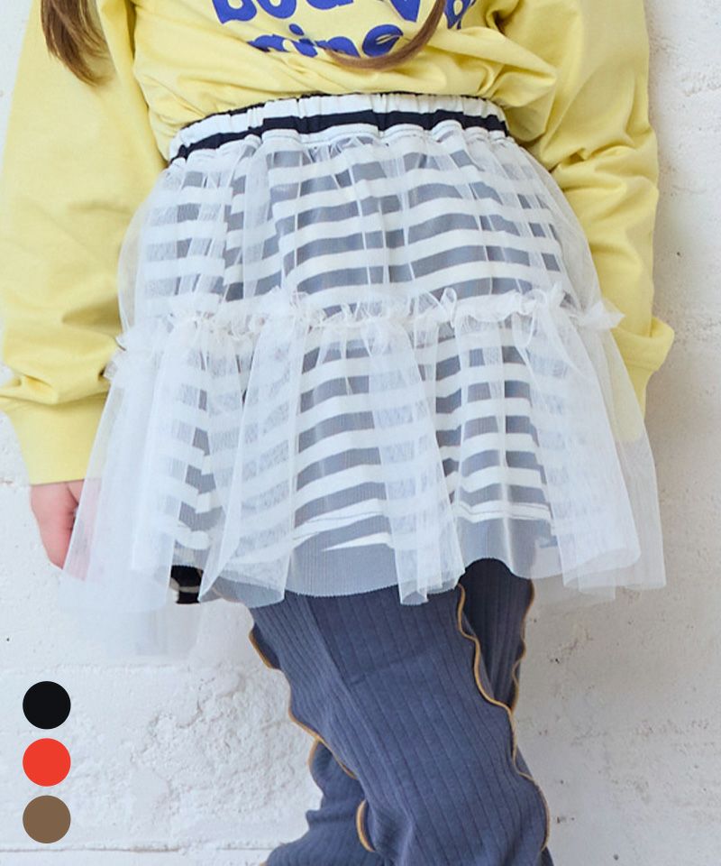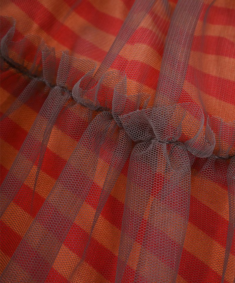 ・ボーダー柄のスカートにチュールを重ねた異素材レイヤードデザイン