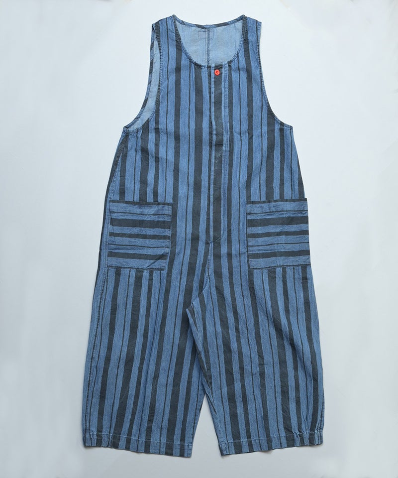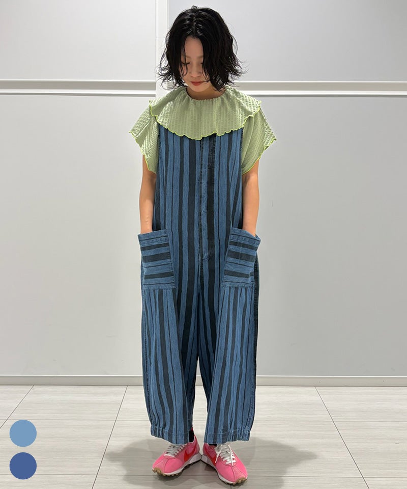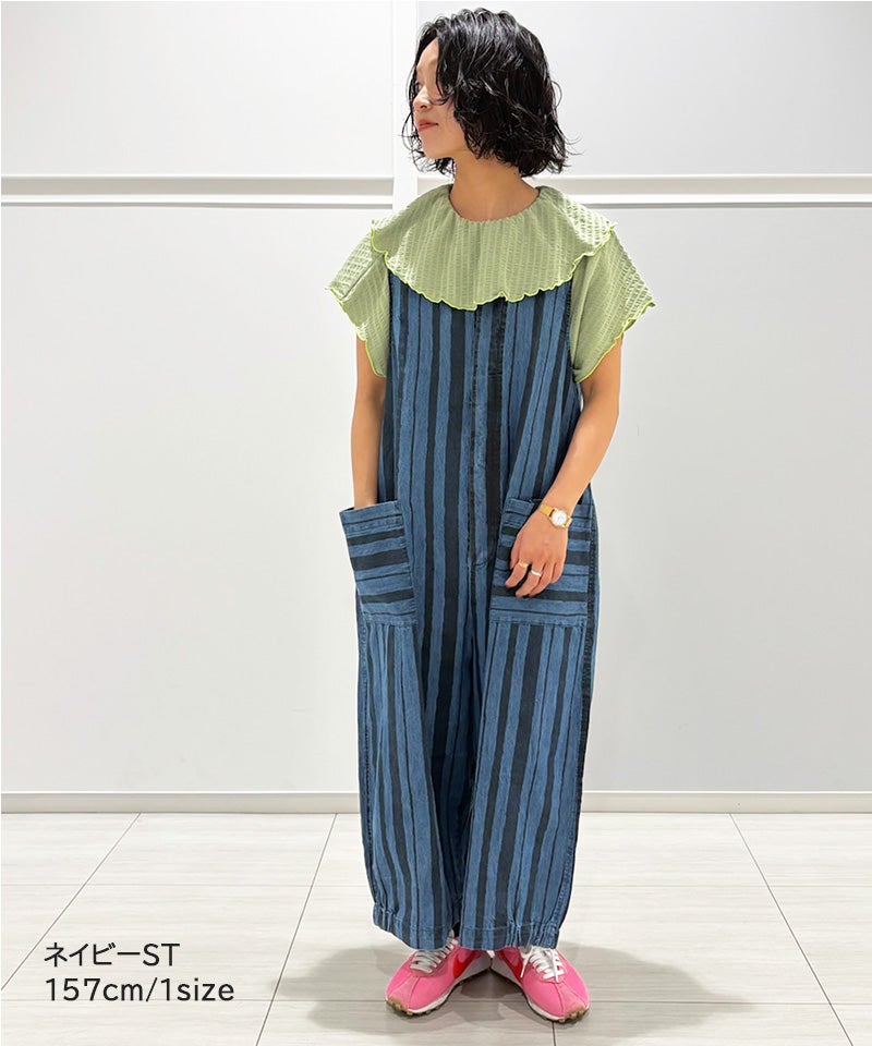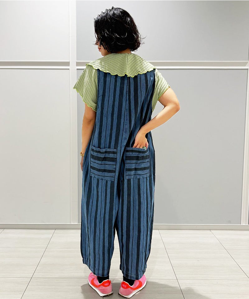 ストライプ柄のデニムが目を引く、ルーズシルエットのサロペットです。