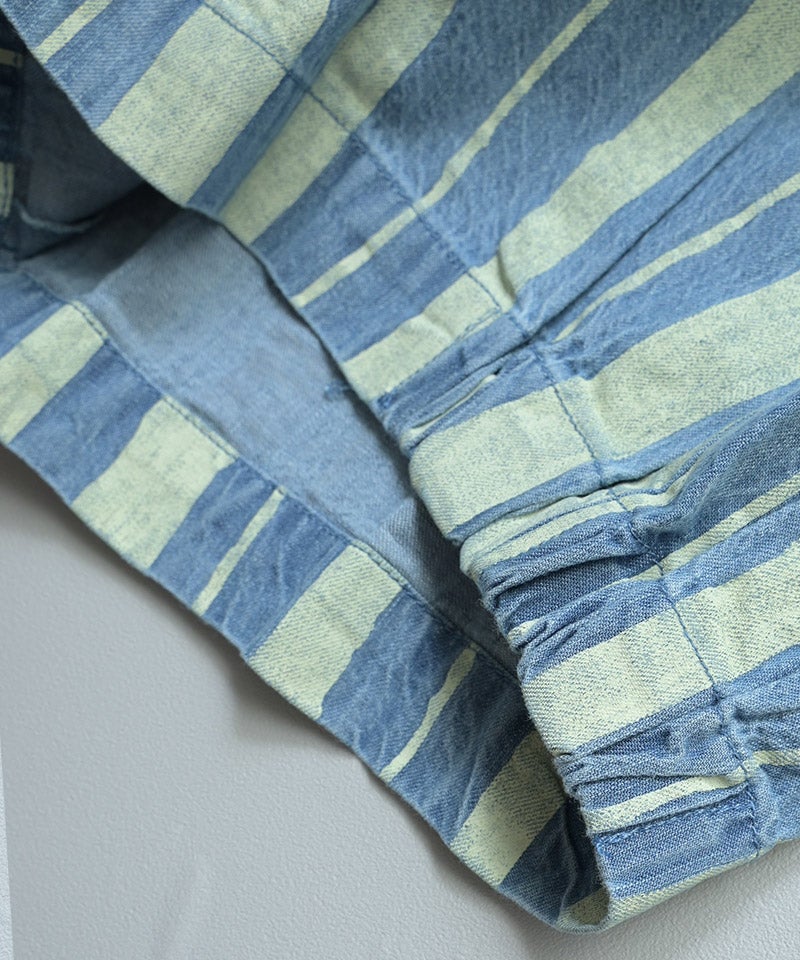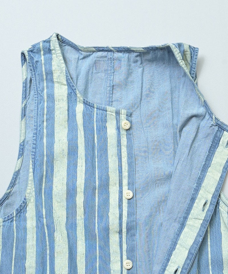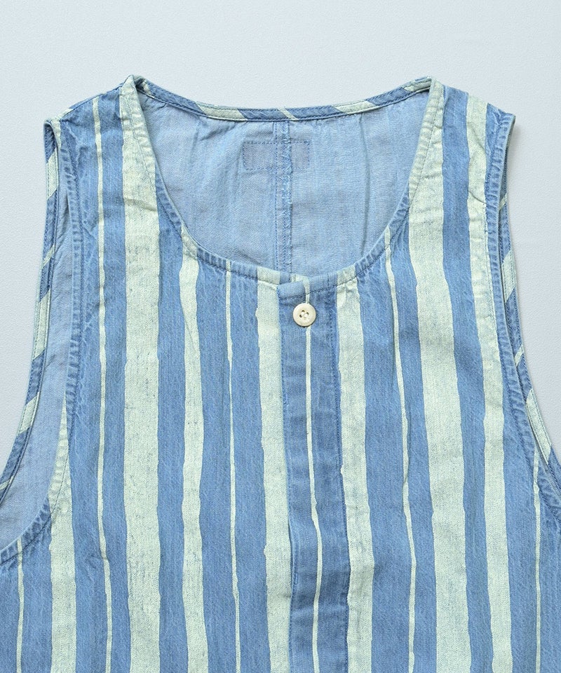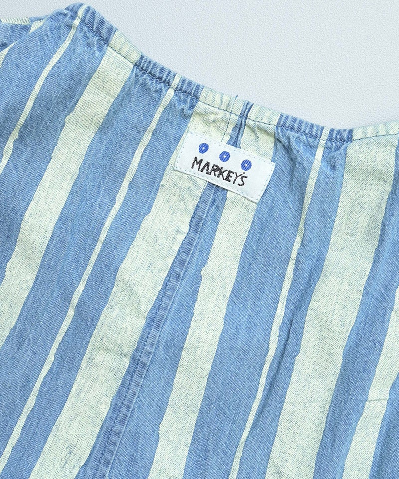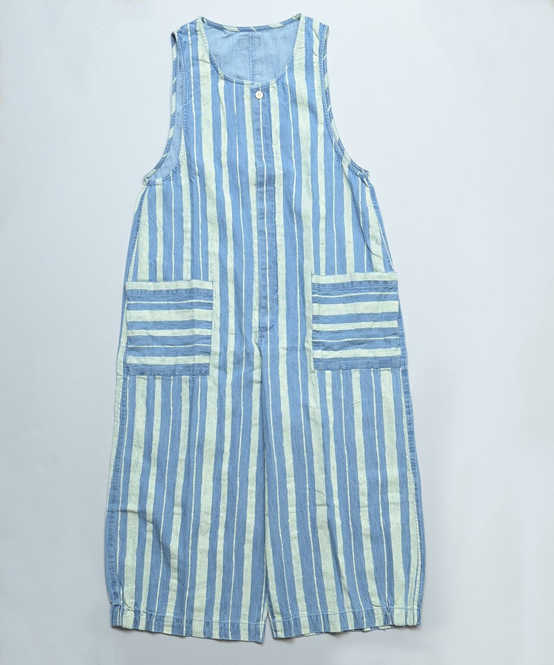 ストライプ柄のデニムが目を引く、ルーズシルエットのサロペットです。