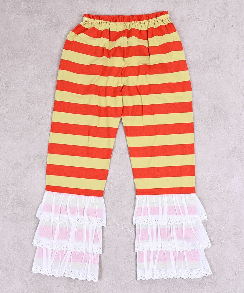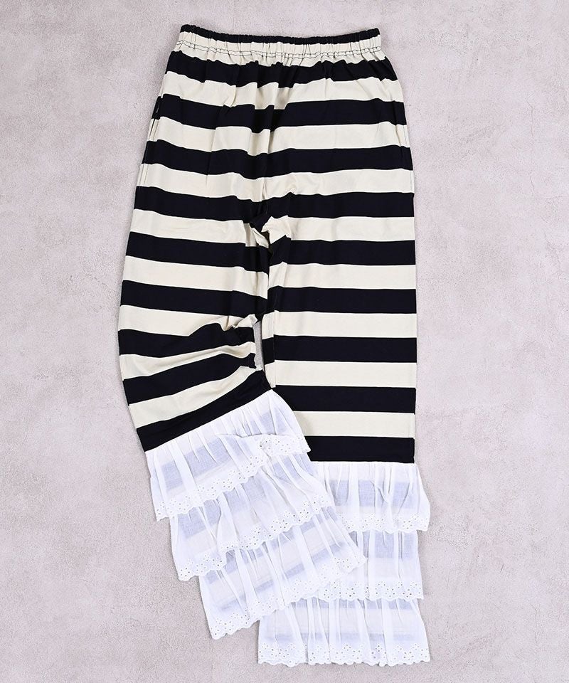 はっきりとしたボーダー柄に、裾のレースフリルティアードを重ねた主役級パンツです。