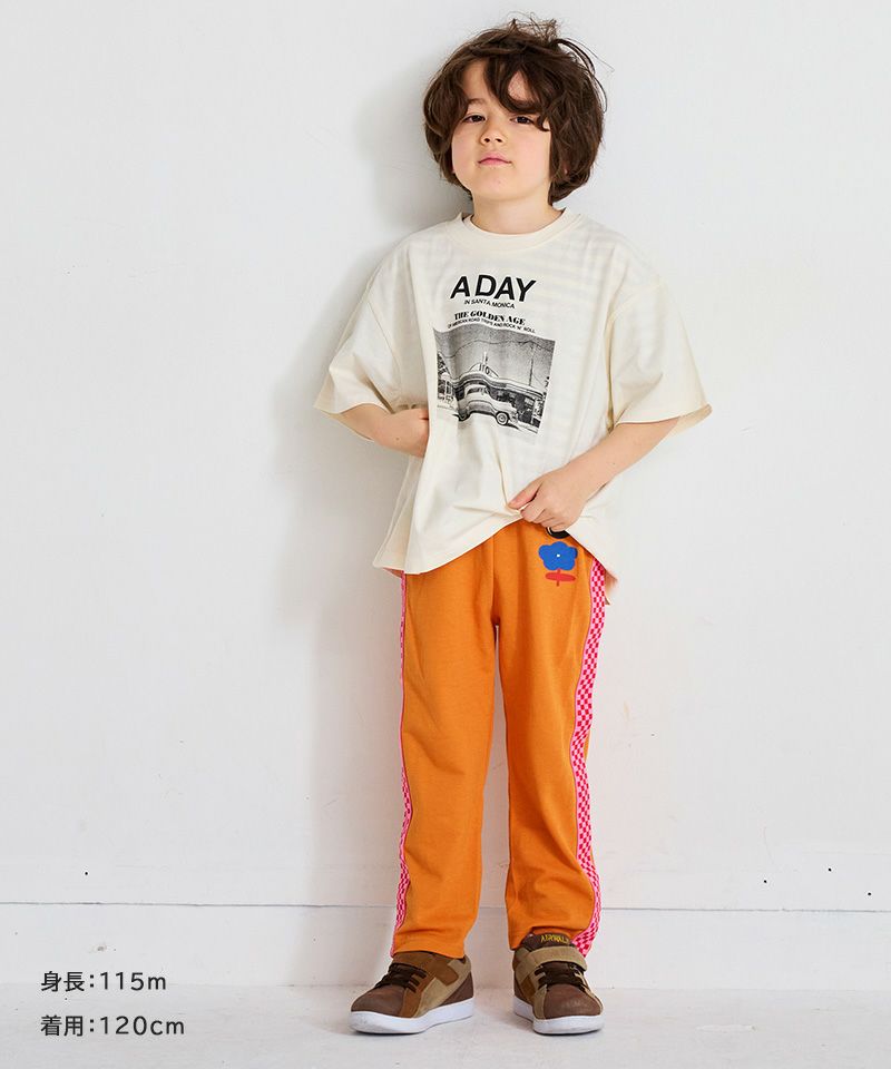 カラーとチェッカーラインが目を引くので、シンプルなトップスでコーデが完成します。