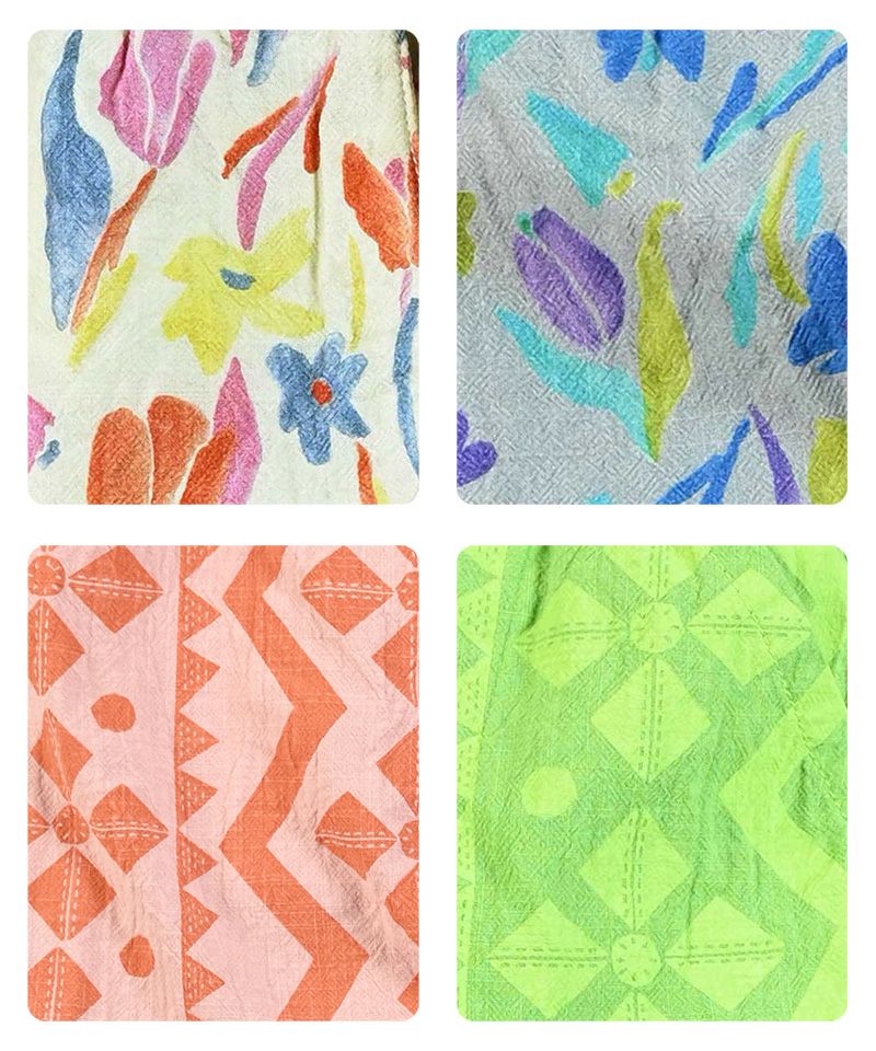 凸凹感のある柔らかいコットン素材にオリジナルの花柄、総柄、無地の4柄8色展開です。