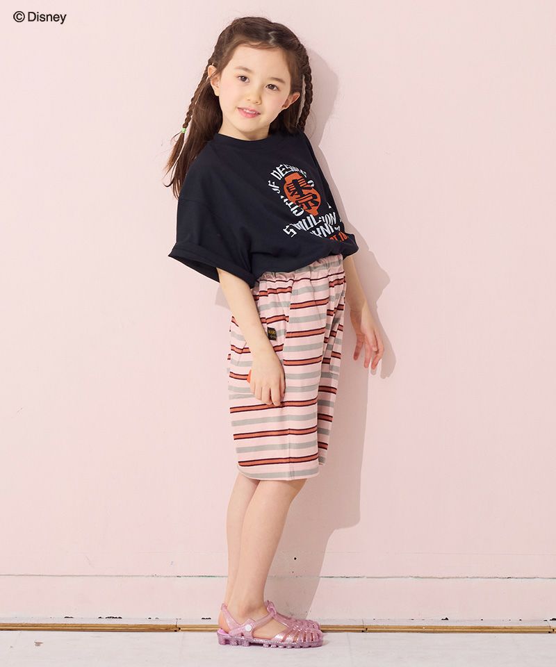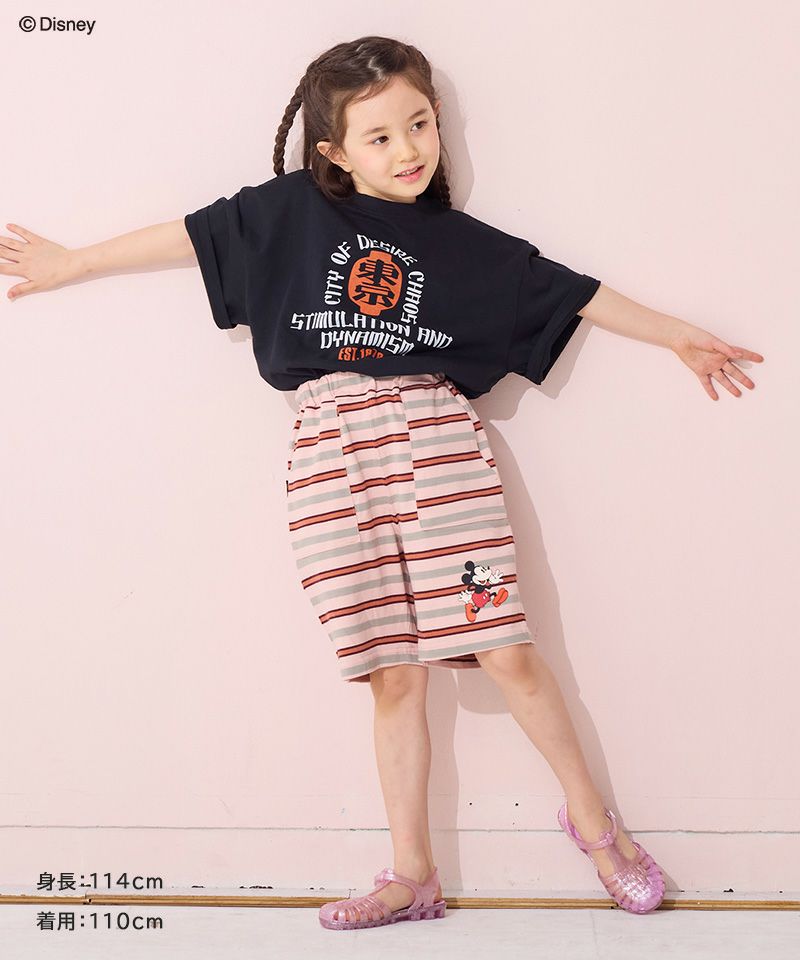 フロントのミッキーマウスのプリントがコーデの主役。