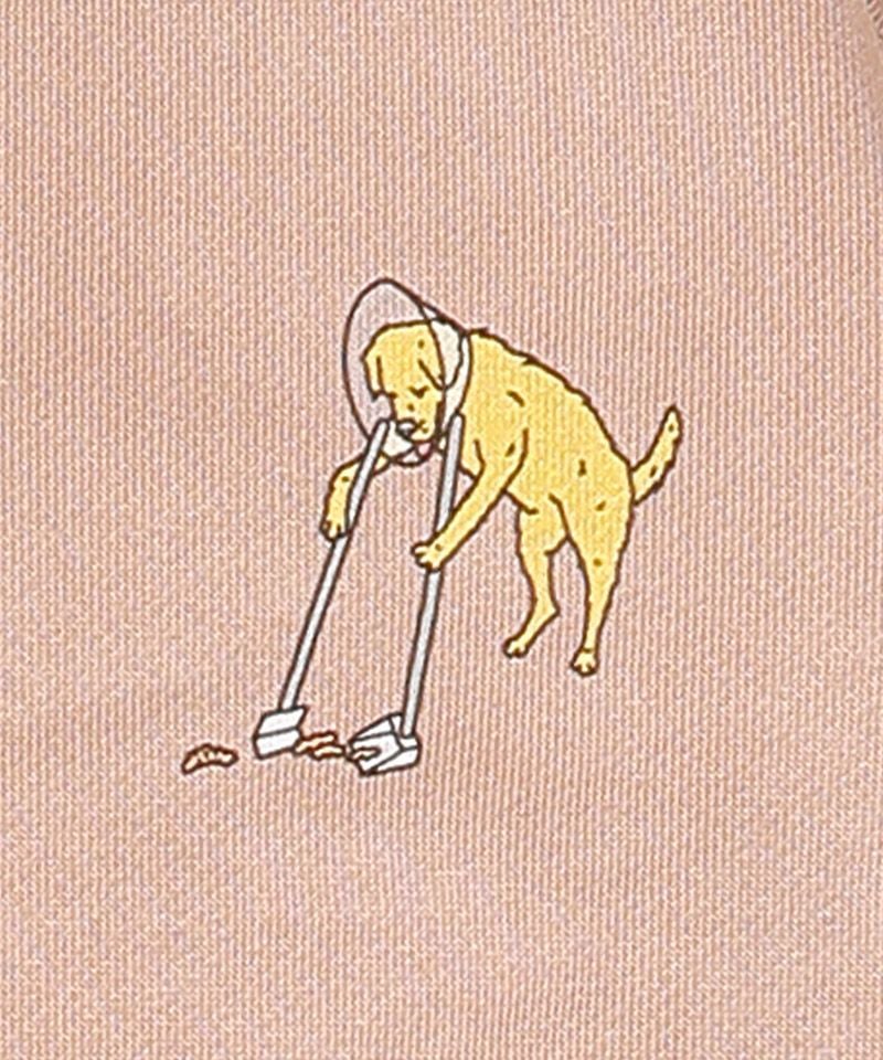 BACKのプリントで犬の散歩中の出来事をFRONTで犬自らが掃除してるなんとも言えないユーモア溢れた商品になっています。