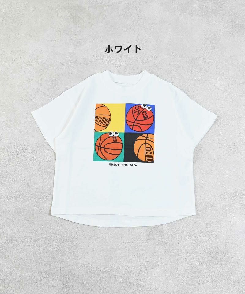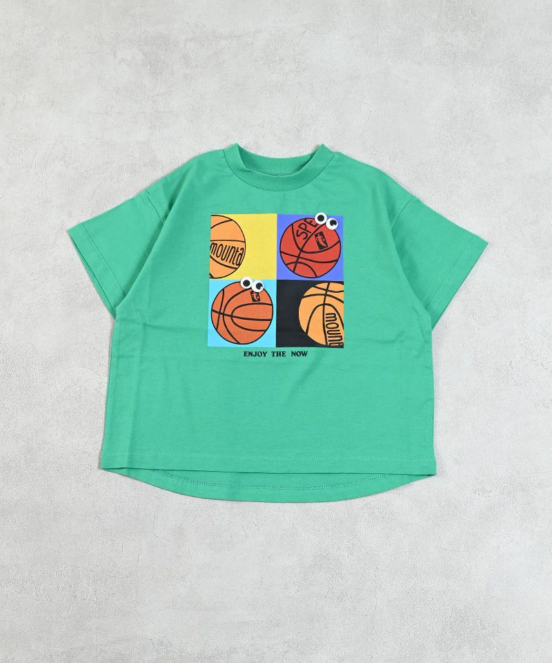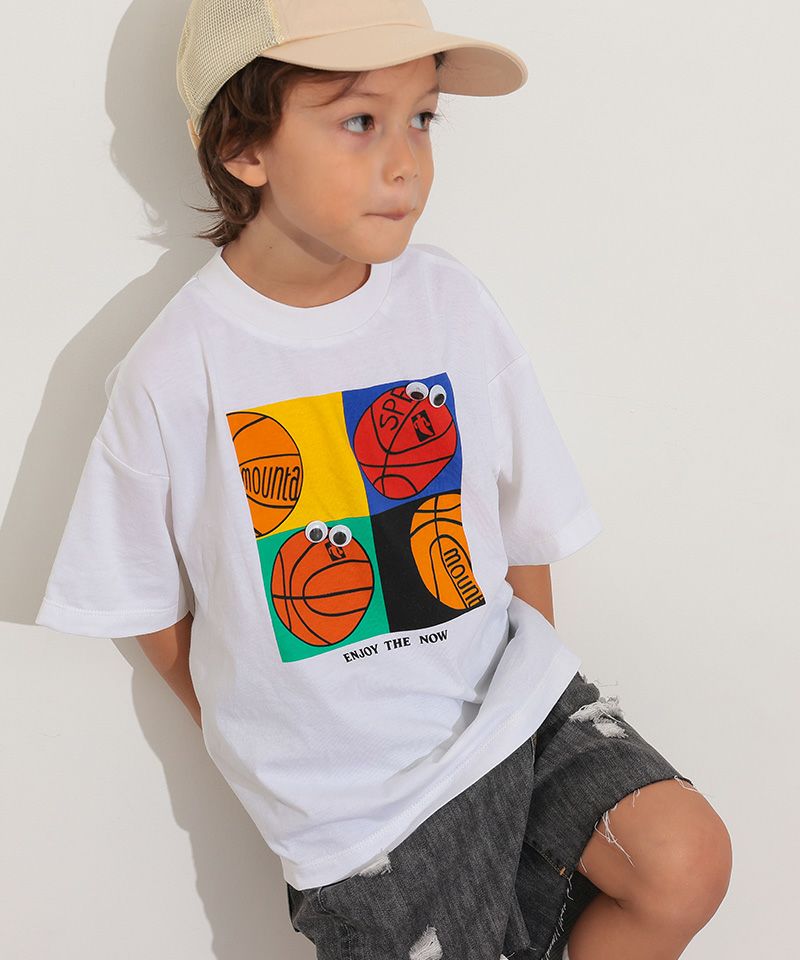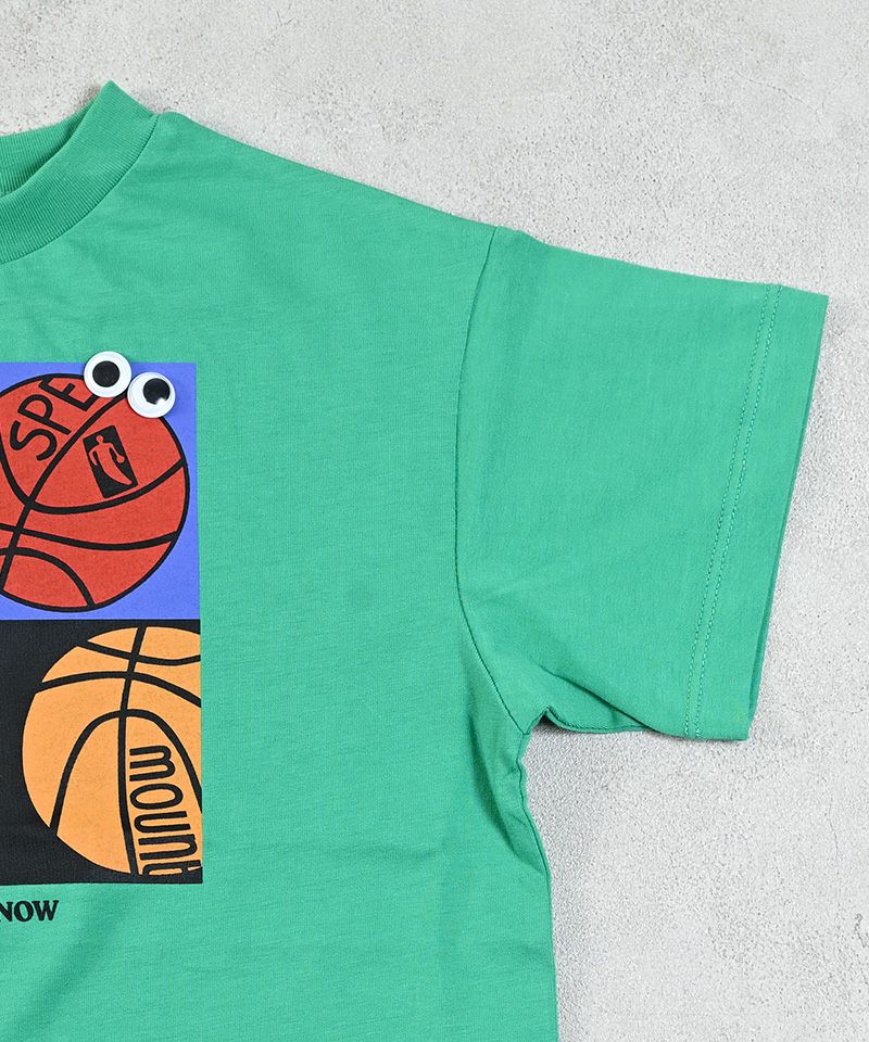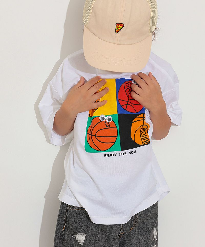 明るくポップな配色のバスケットボールモチーフに、大きな目玉が付いたキャッチーなTシャツ。