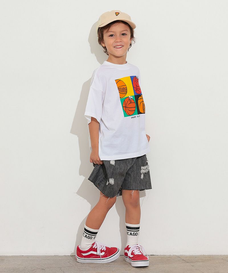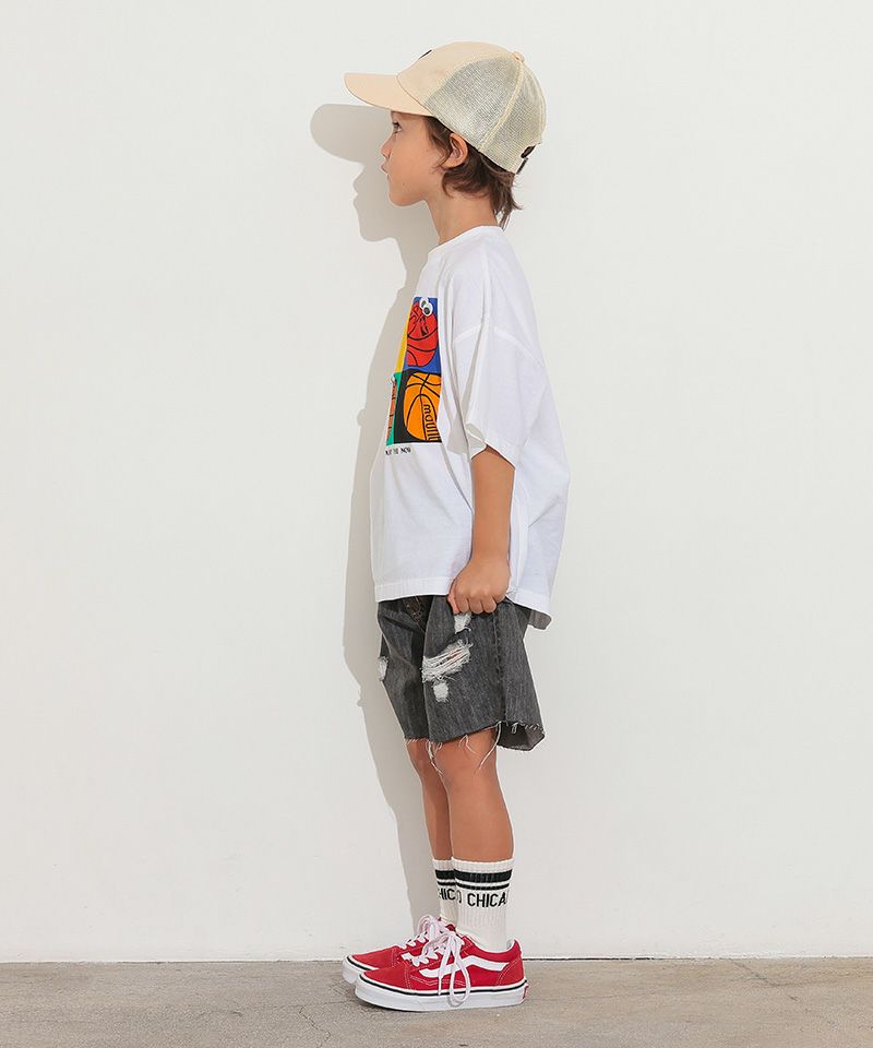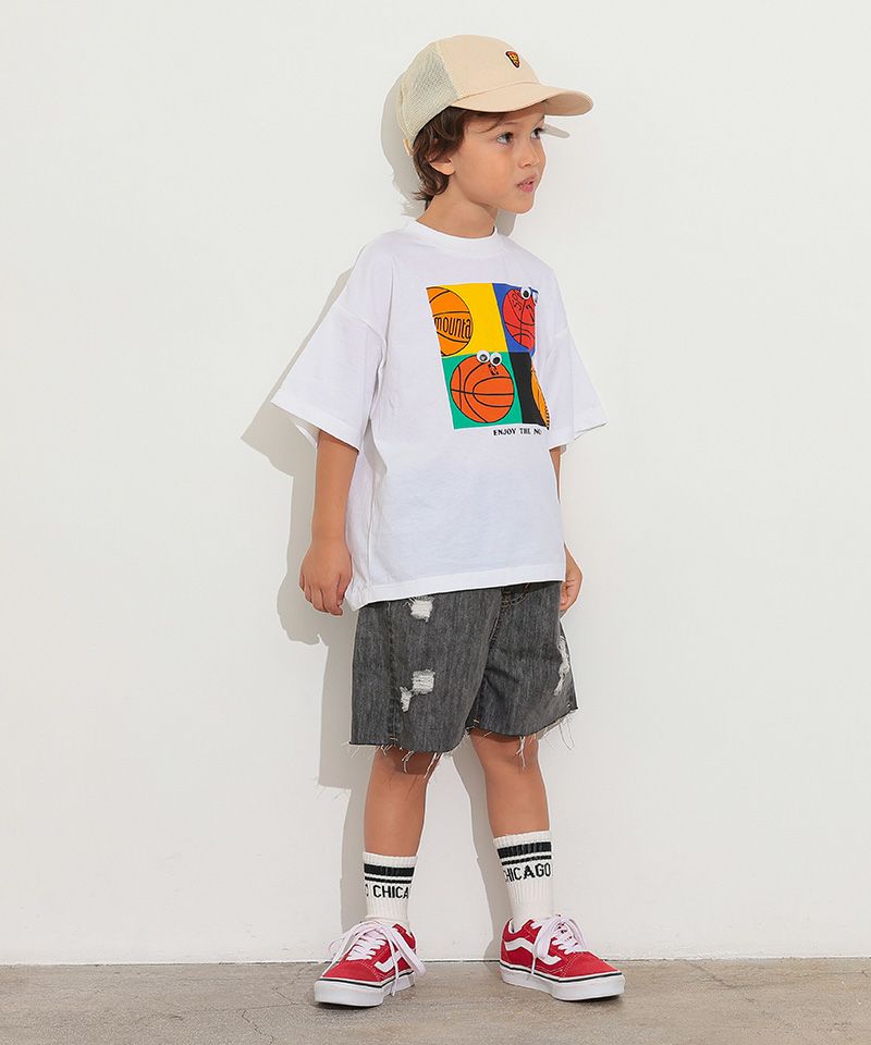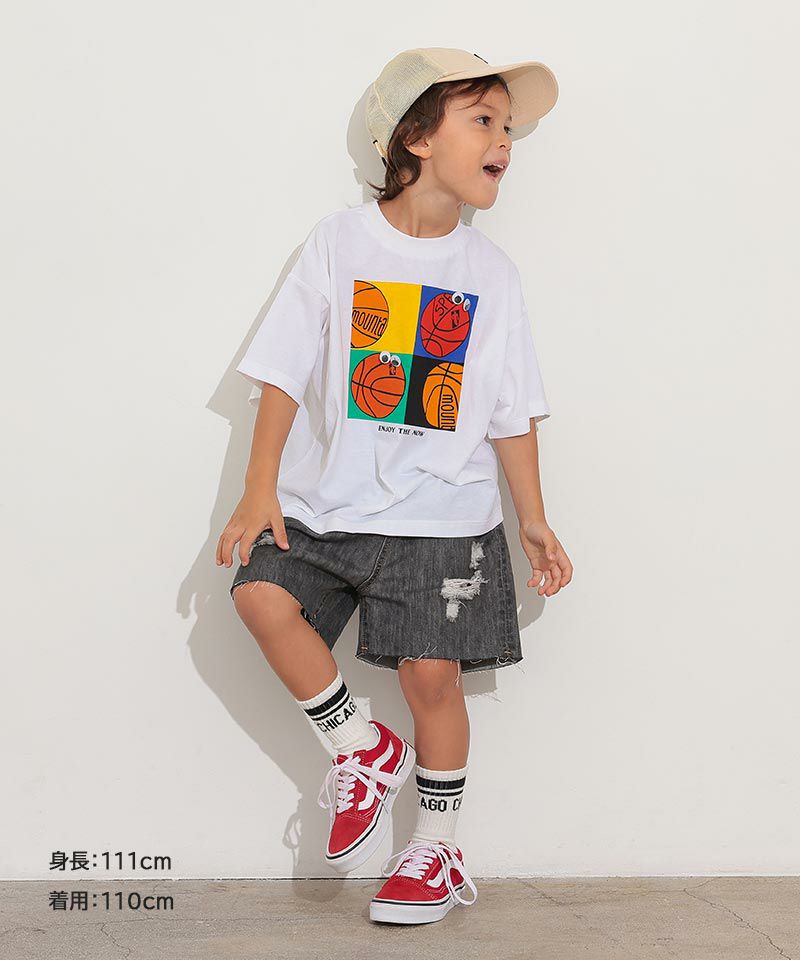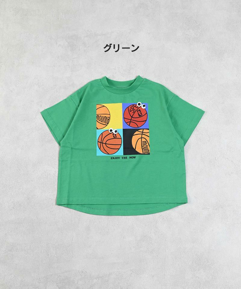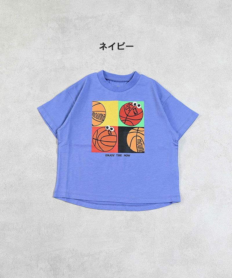 明るくポップな配色のバスケットボールモチーフに、大きな目玉が付いたキャッチーなTシャツ。