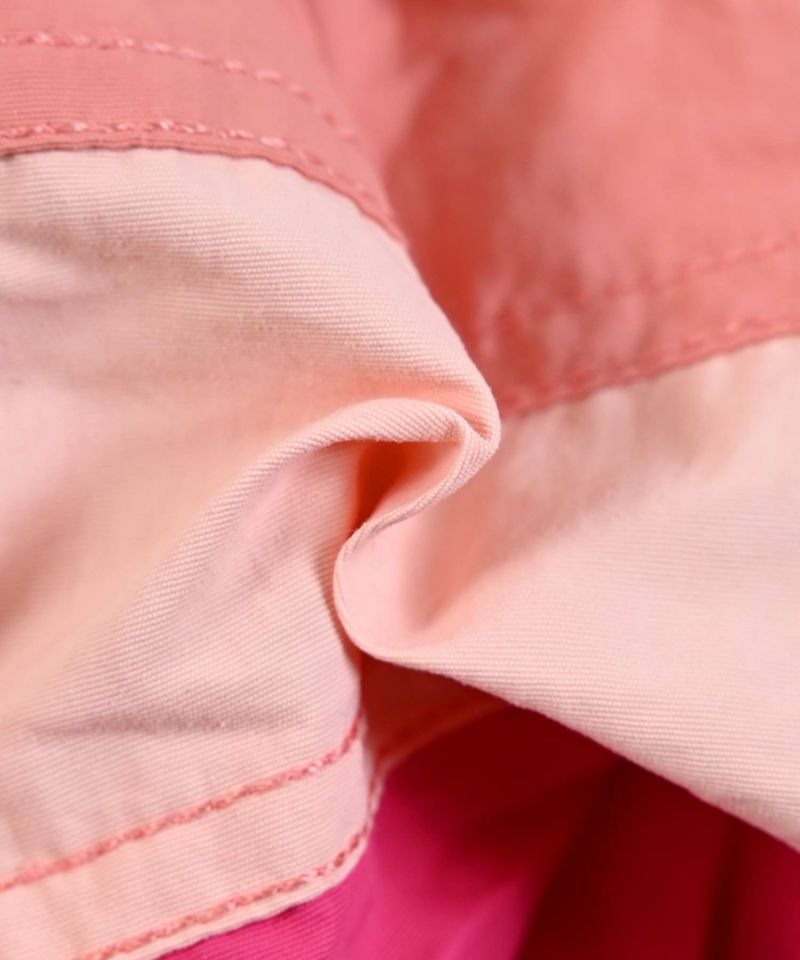 漁網をリサイクルして海洋プラスチック汚染の削減に貢献する、速乾性を備えたネットプラス・ポストコンシューマーリサイクル・ナイロン100%のファイユ使用し、PFASを意図的に使用せずに製造されたDWR(耐久性撥水)加工済み。