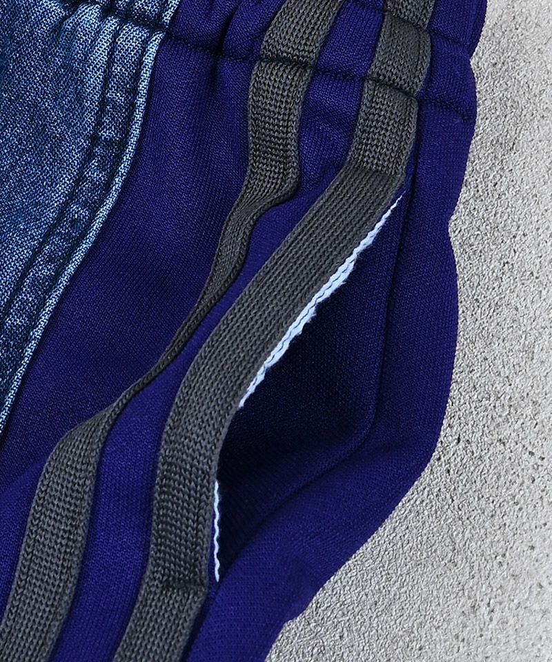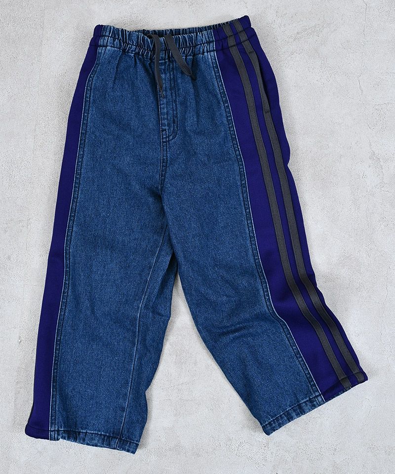 デニムパンツにトラックパンツ風のサイドライン切り替えをプラスした、リメイク感のある1本です。