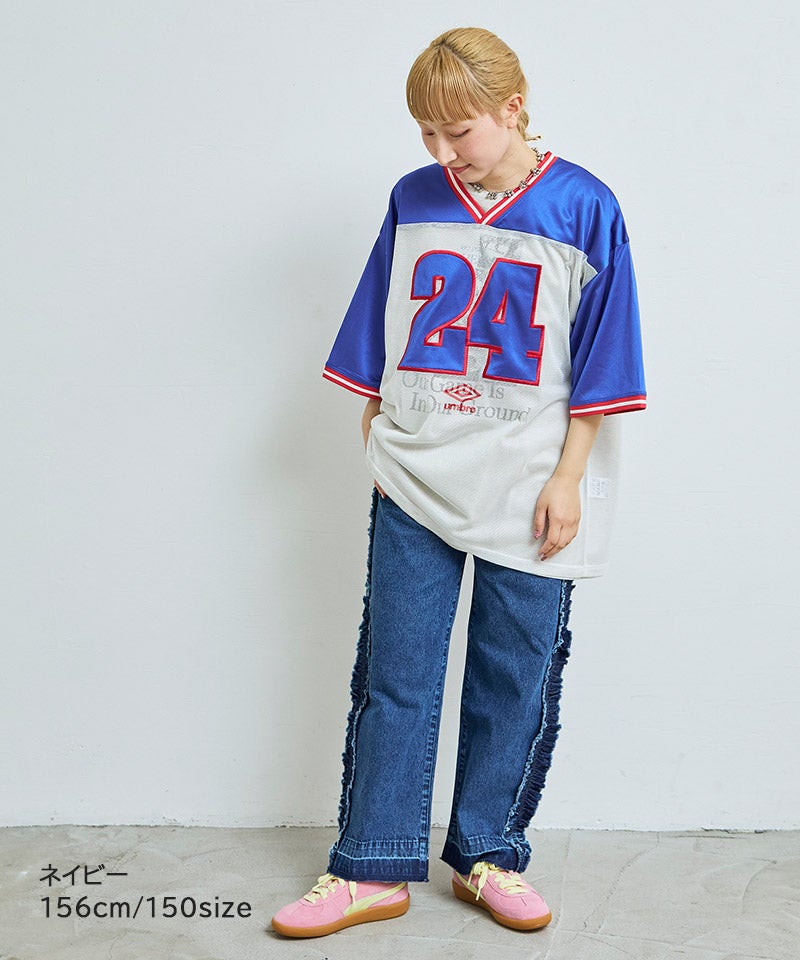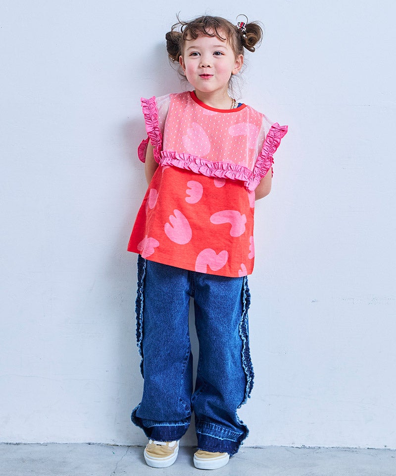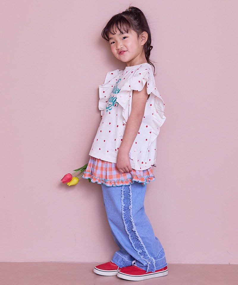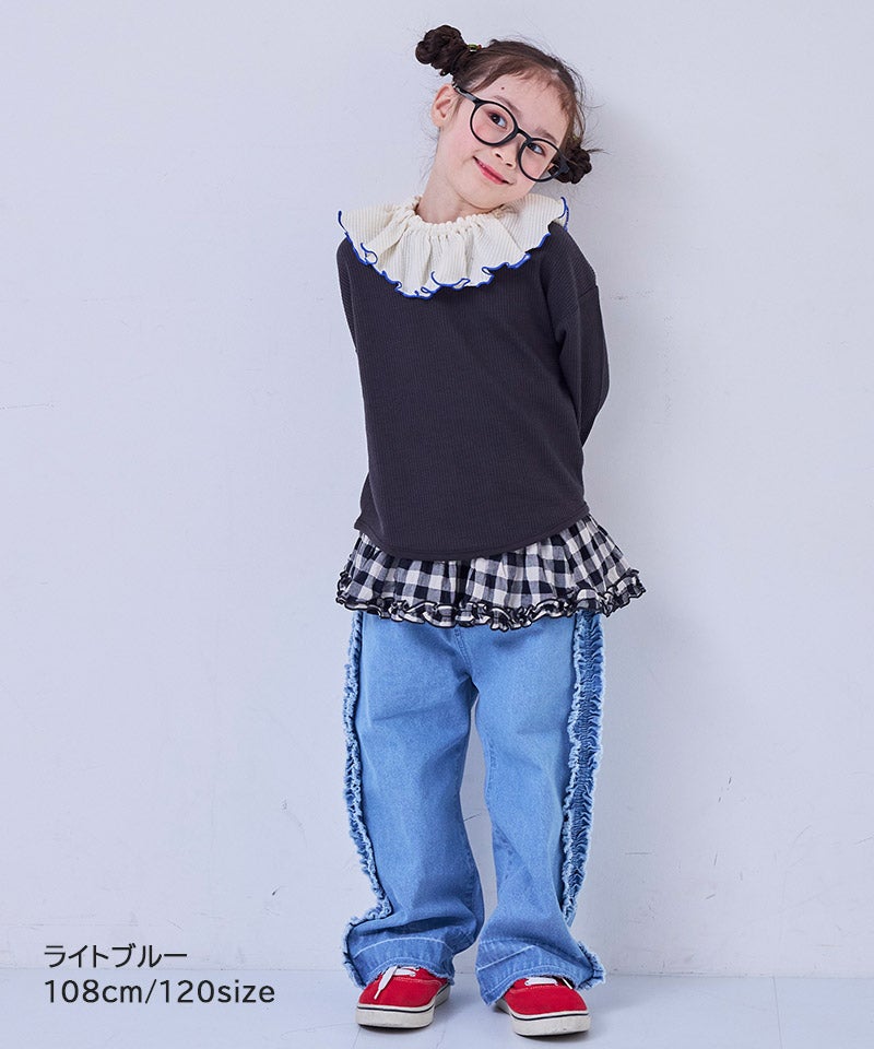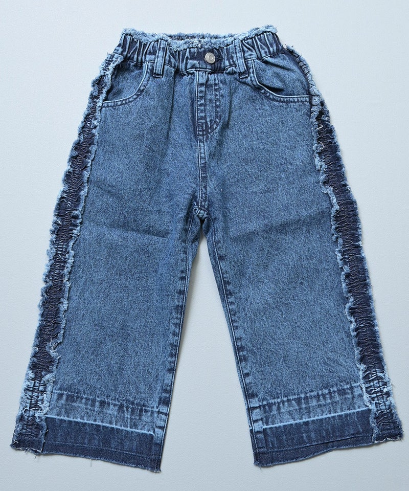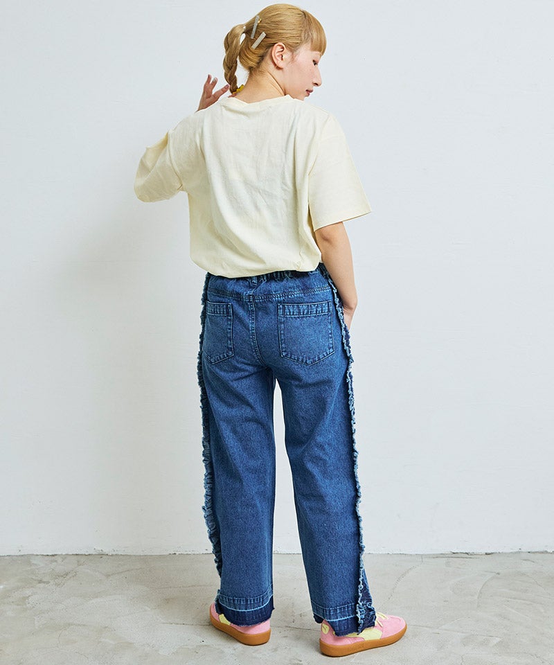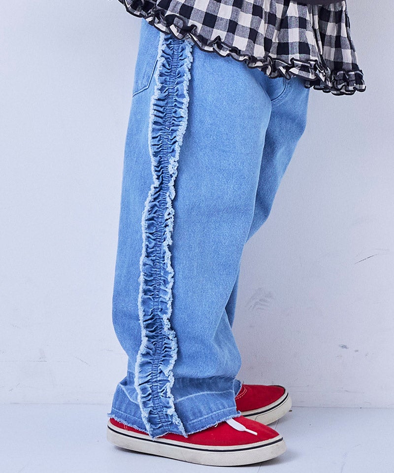 サイドにたっぷりとあしらったフリンジ風フリルが目を惹くバギーパンツ。