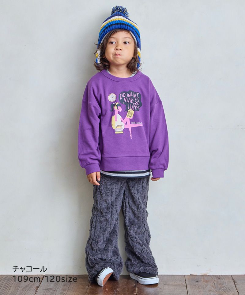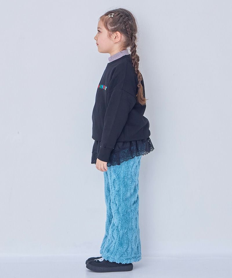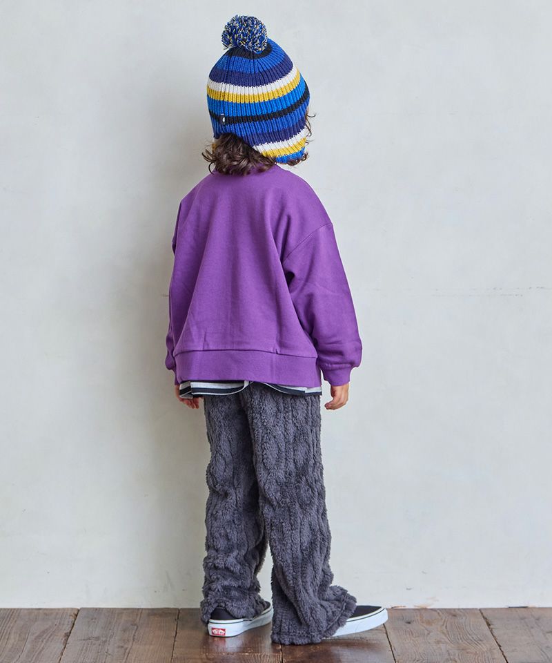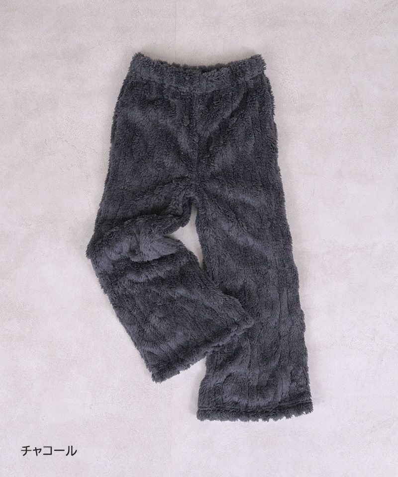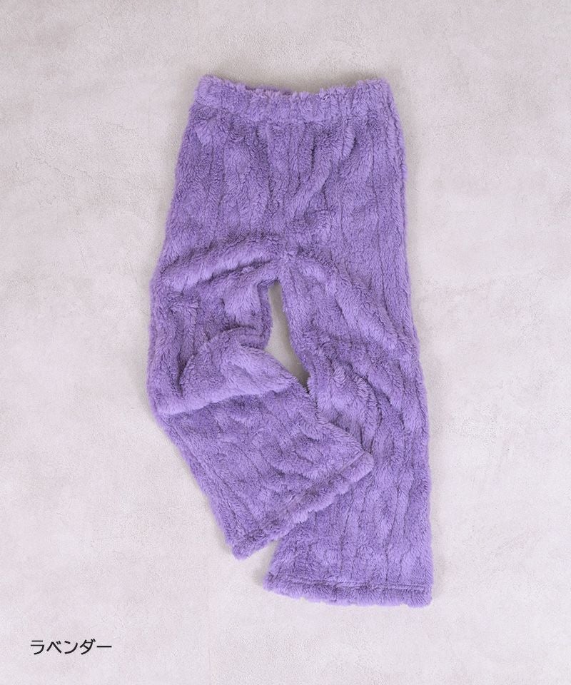 ケーブル編み風の立体感がかわいい、ふわもこボア素材のフレアーパンツ。