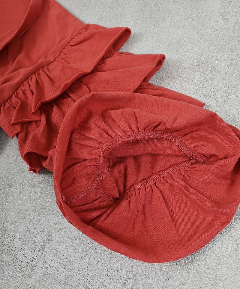 ボリュームたっぷりのフリルが袖に連なった、キュートな存在感のある1枚。