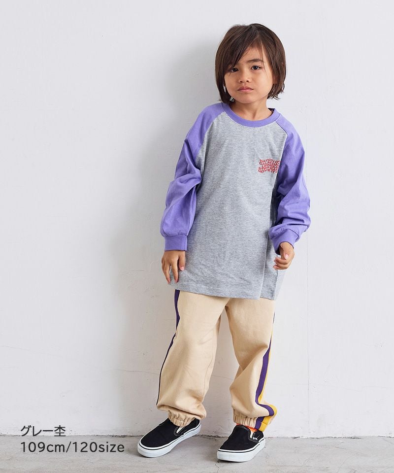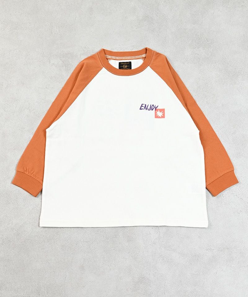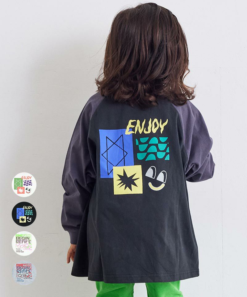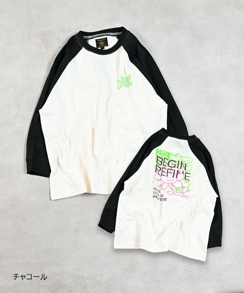 前後で異なるプリントがアクセントになったラグランロンT。