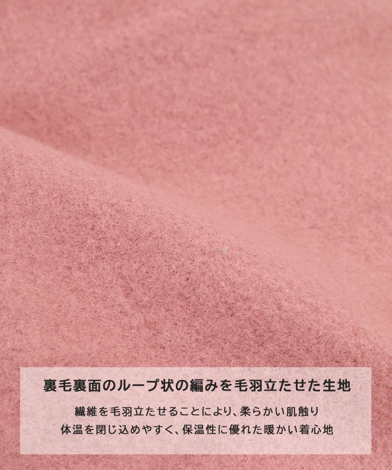 裏毛のループ編みをふんわりと起毛させた、あたたかさのある生地です。
