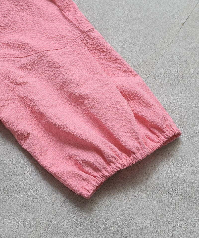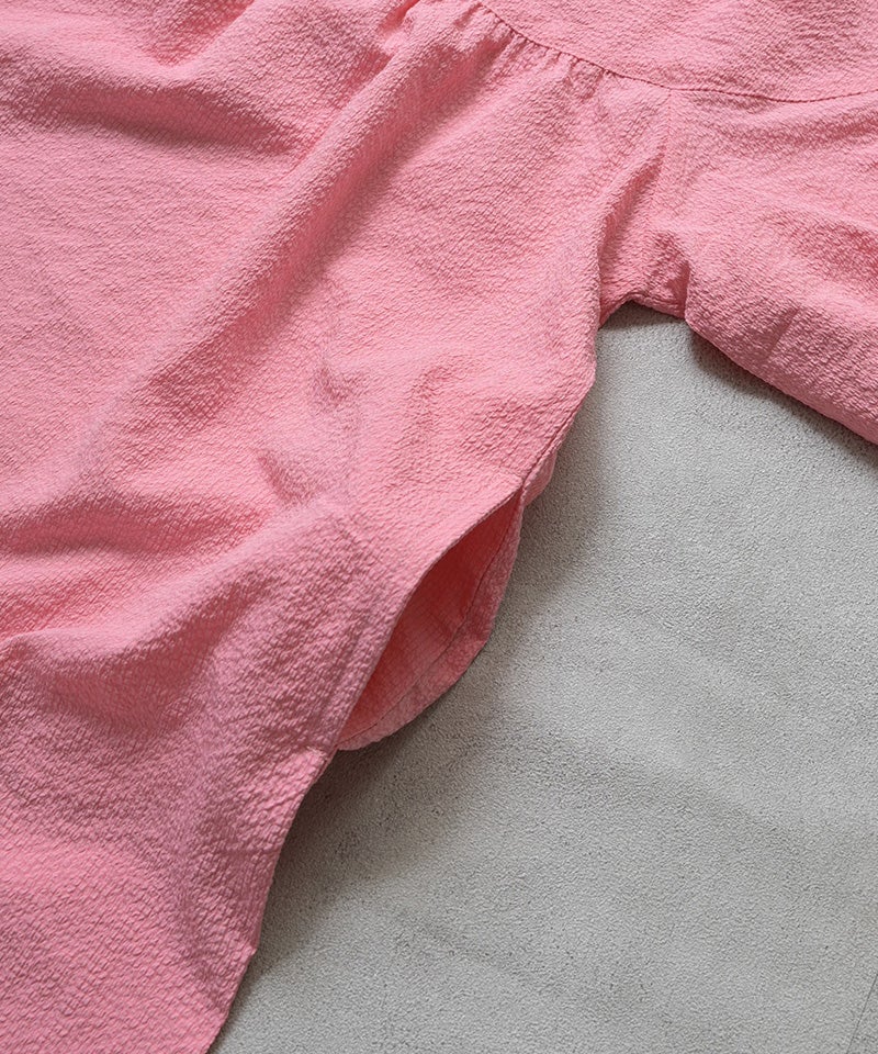 袖はぷっくりとしたパフスリーブで、腕まわりをやさしくカバーします。