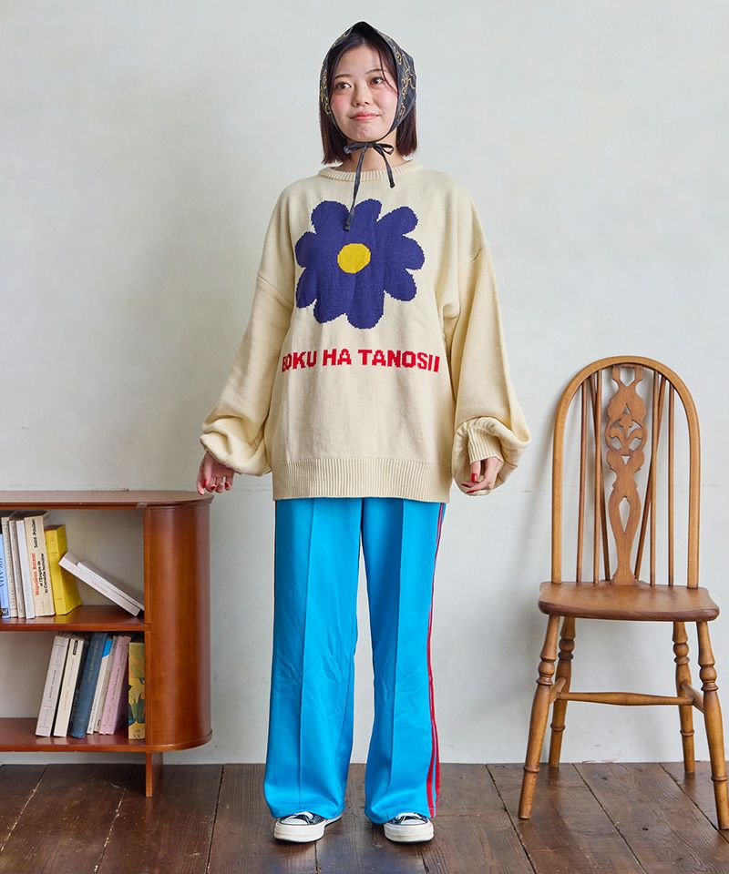 インパクトのあるレトロな大きいお花とロゴが目を引くデザインです。