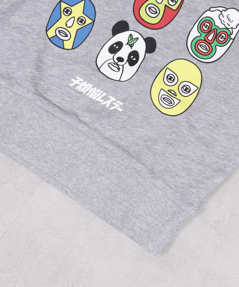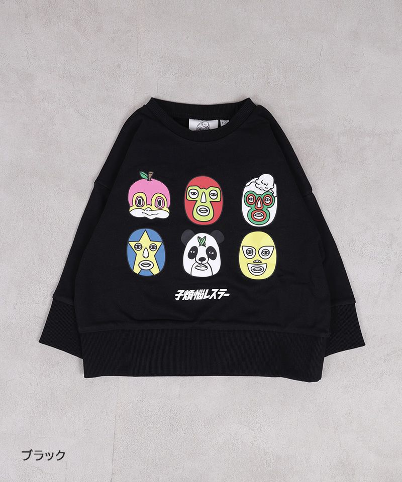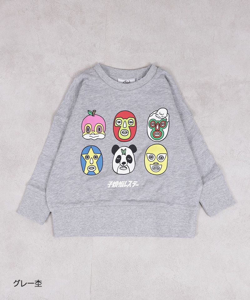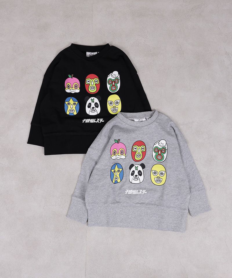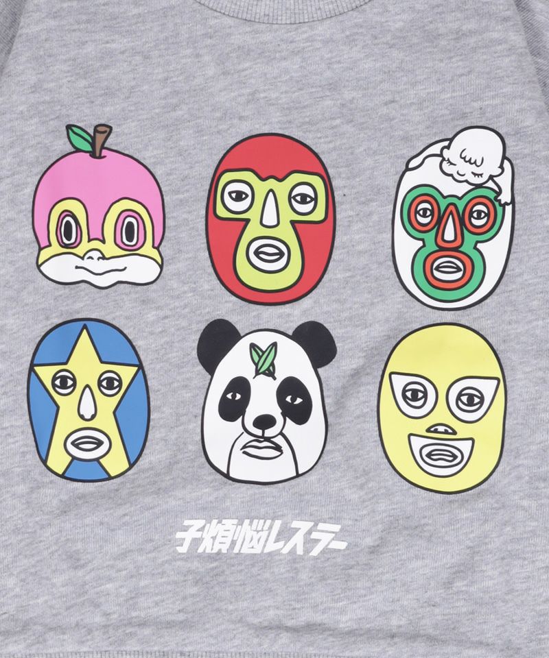 ○人気の“子煩悩レスラー”のキャラクターマスクがずらりと並んだ、遊び心あふれるプリントが魅力の一枚です。