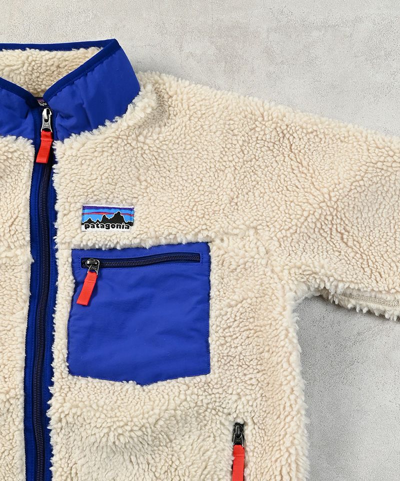 ソフトなリサイクル・ポリエステル100%の6ミリ厚パイル・フリースを使用した、防風性と保温性を提供するキッズ用のレトロX・ジャケットは、リサイクル・ポリエステル100%のタフタの裏地付き。