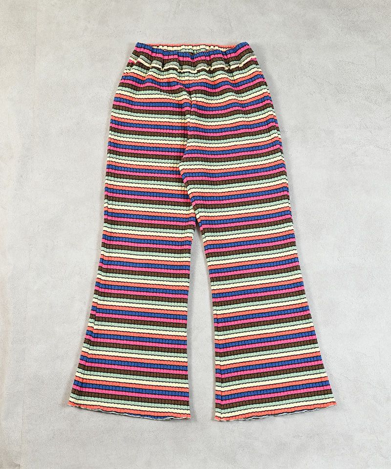 元気いっぱいのマルチボーダー柄が目を引くフレアパンツ。