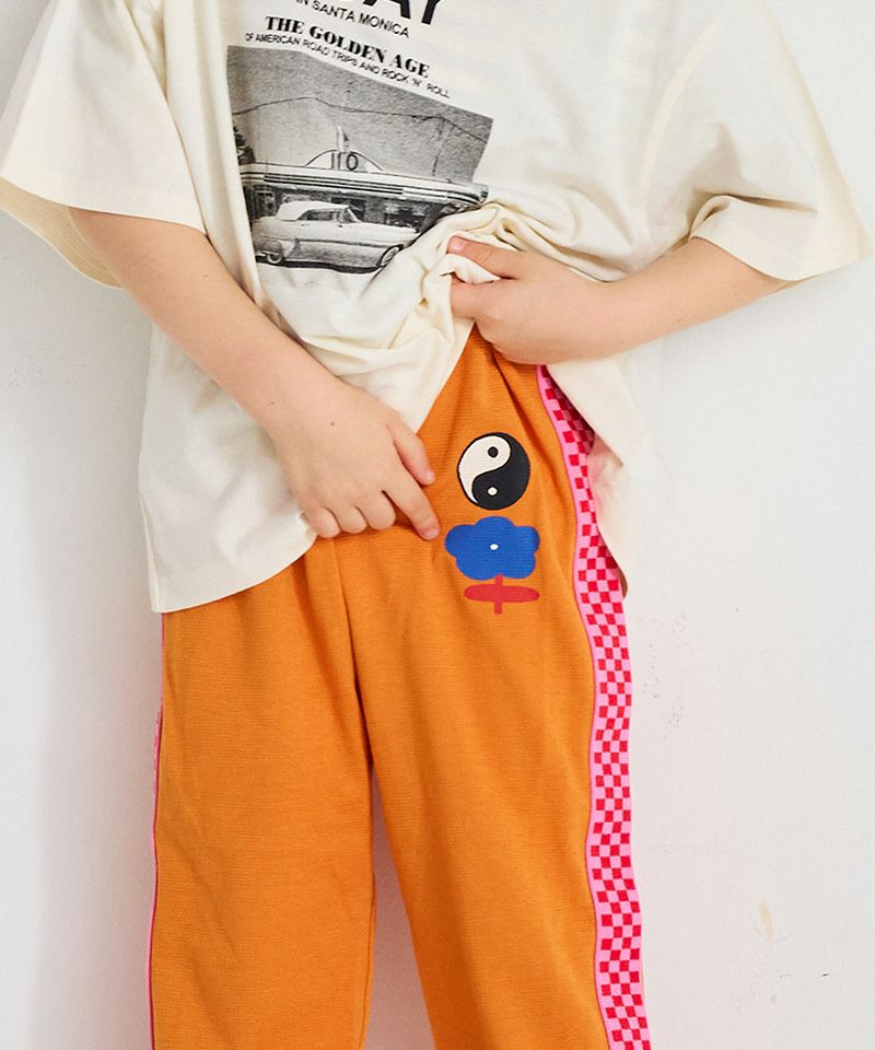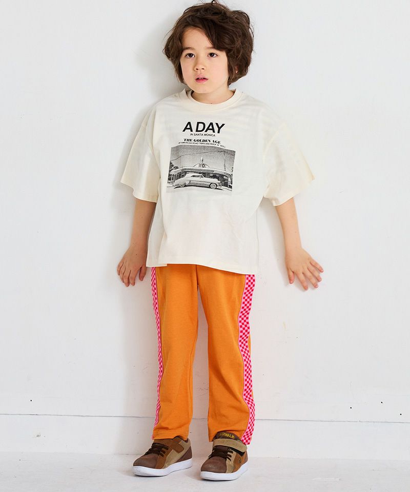 カラーとチェッカーラインが目を引くので、シンプルなトップスでコーデが完成します。