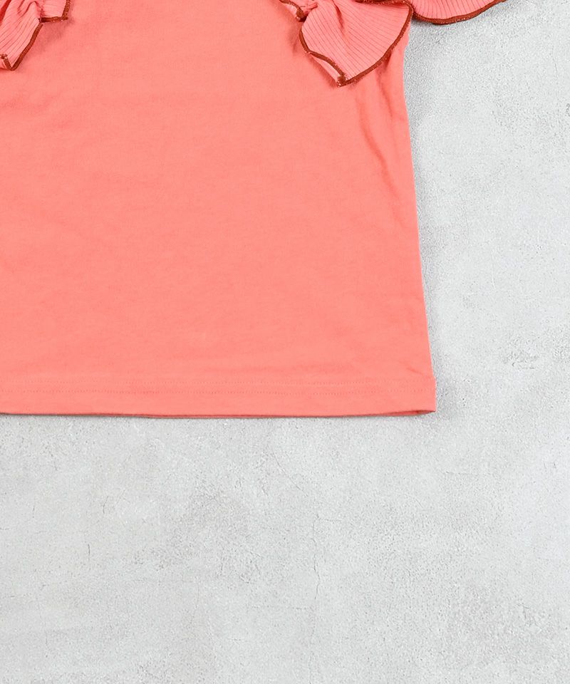 ボリュームフリルを施したガーリーデザインTシャツを、トレンドのオープンアームデザインに。