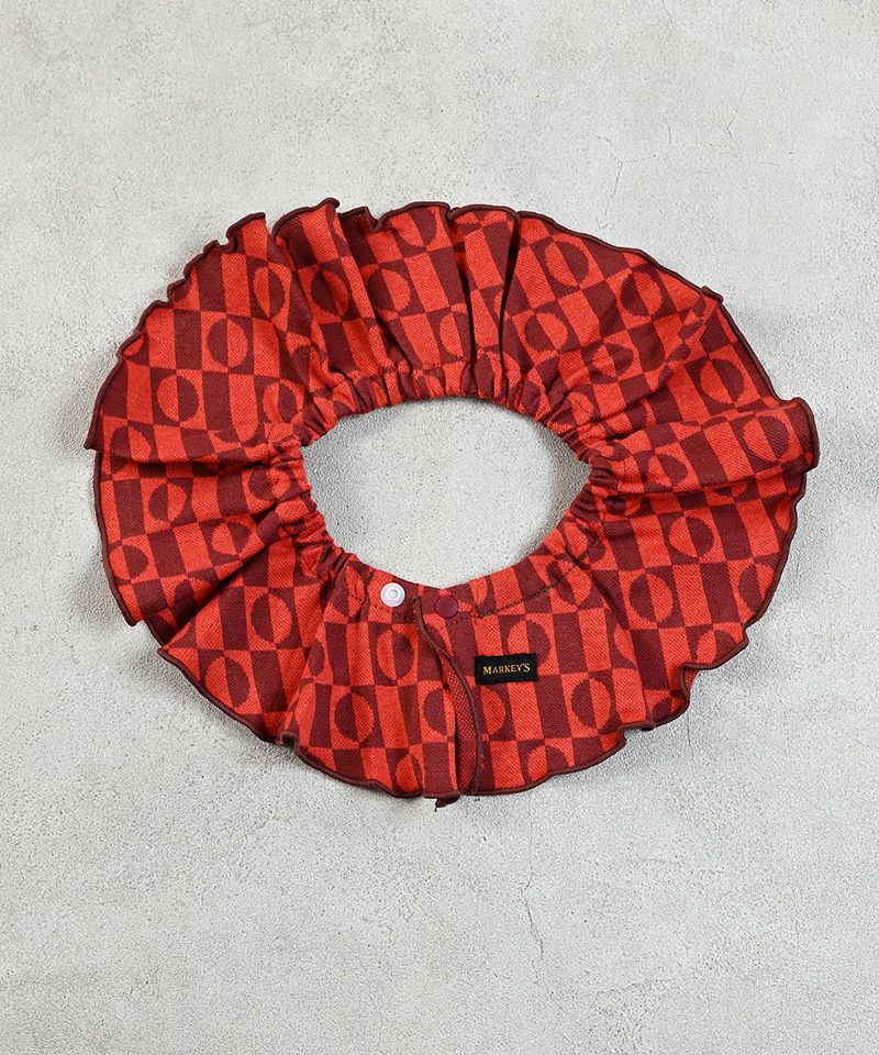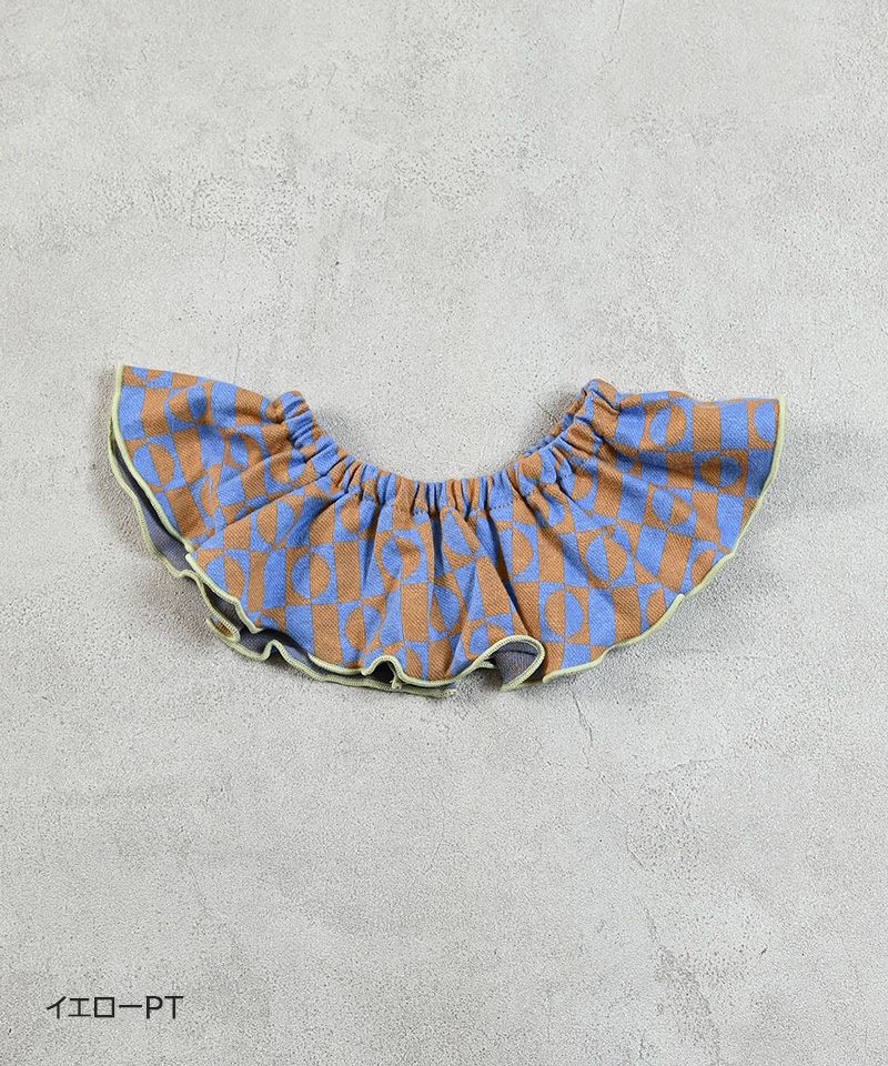 存在感のある総柄ジャガード生地に、フリルをたっぷりあしらったスタイ。
