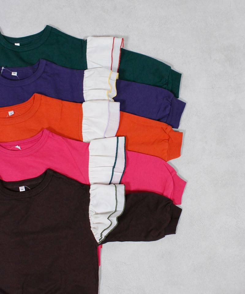 シンプルながらも袖のフリルが目を引き、1枚で着映えるアイテムです。