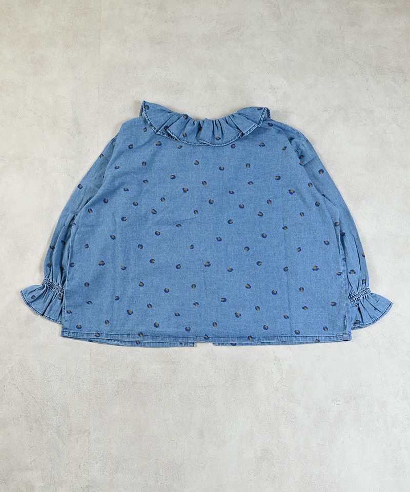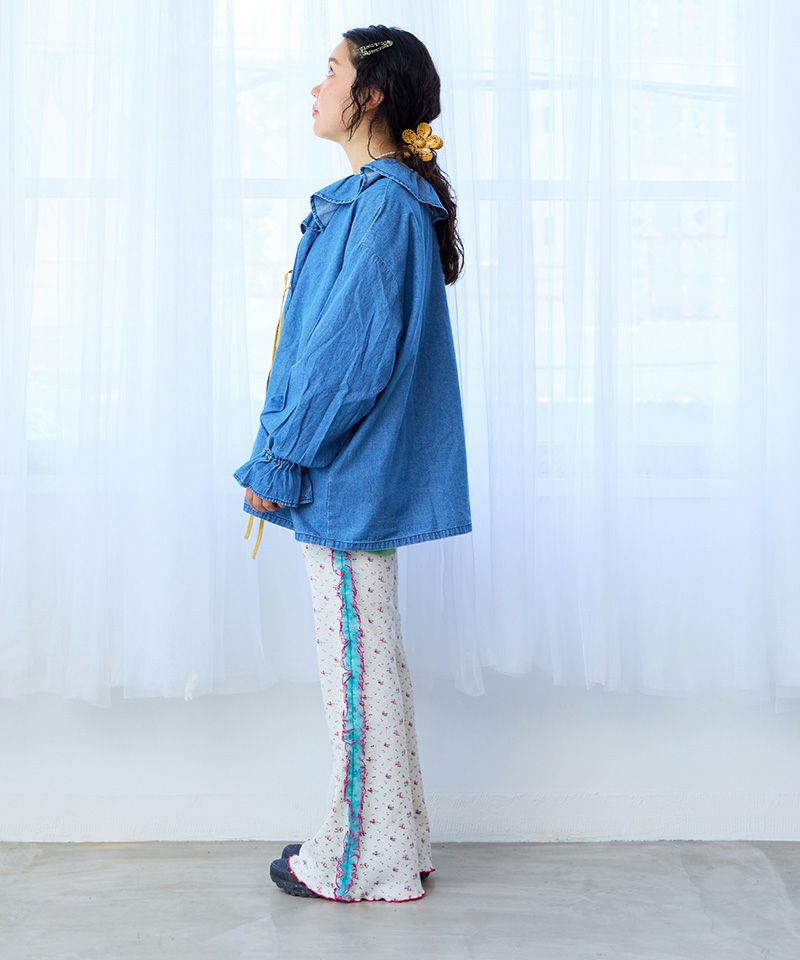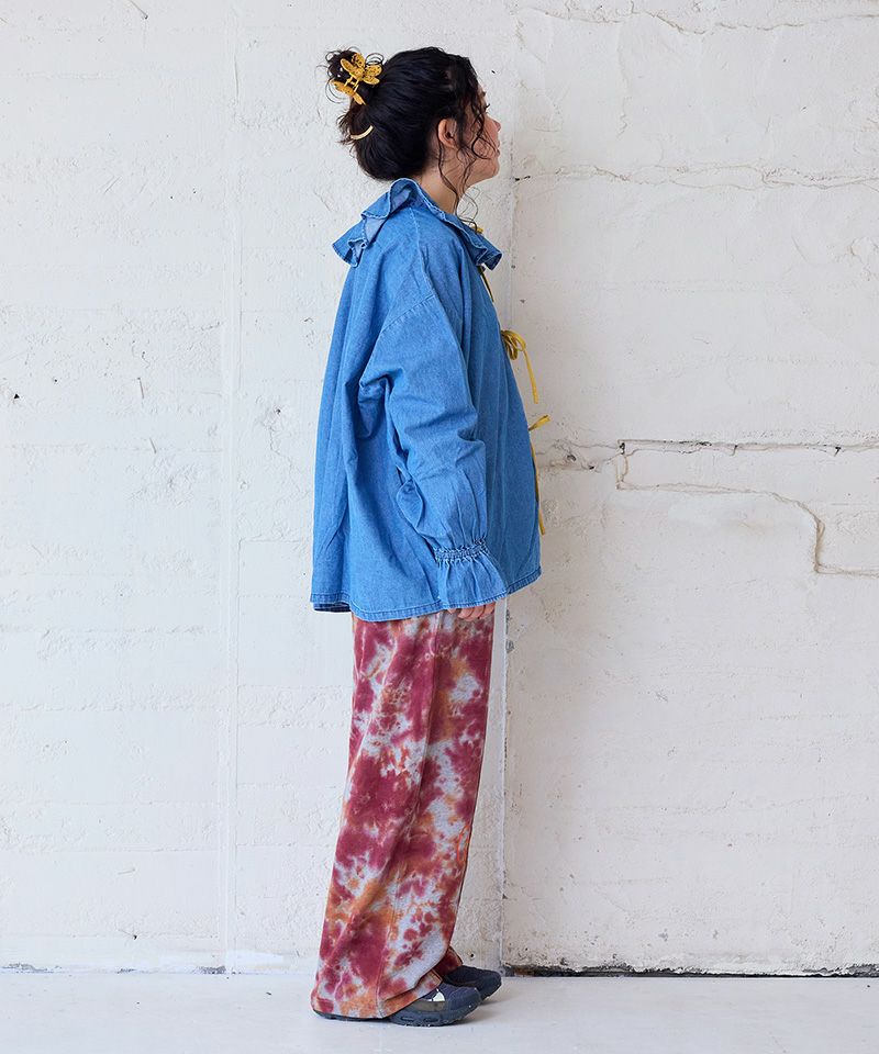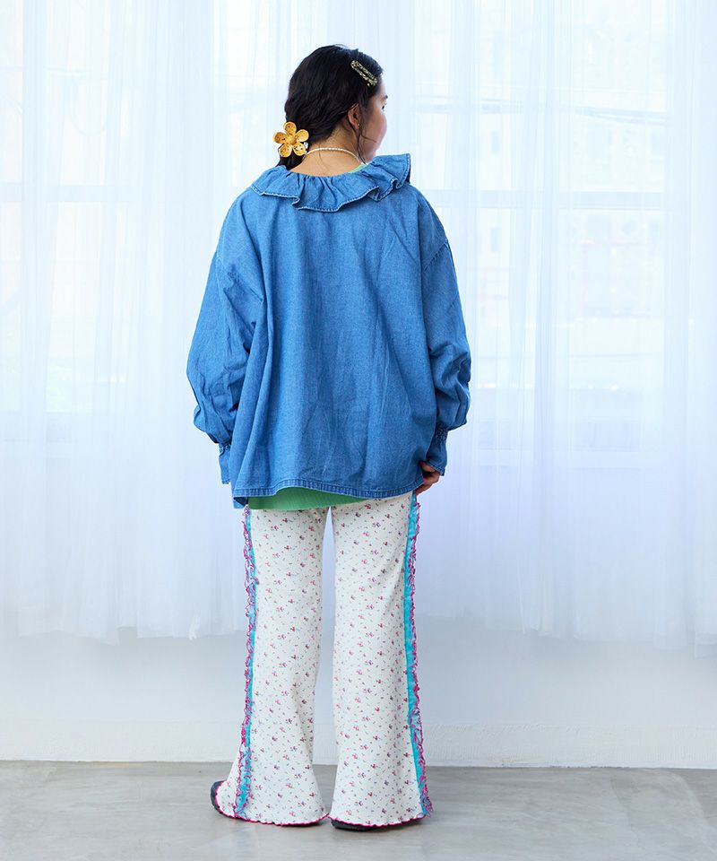 デニム+レオパードプリントにフリルカラーがポイントのブラウス。
