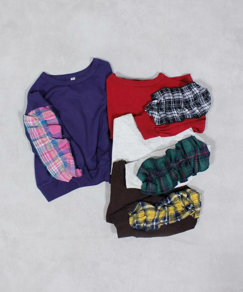 身頃は柔らかな裏毛素材、袖にはビエラチェック生地のフリルが印象的なデザイン。